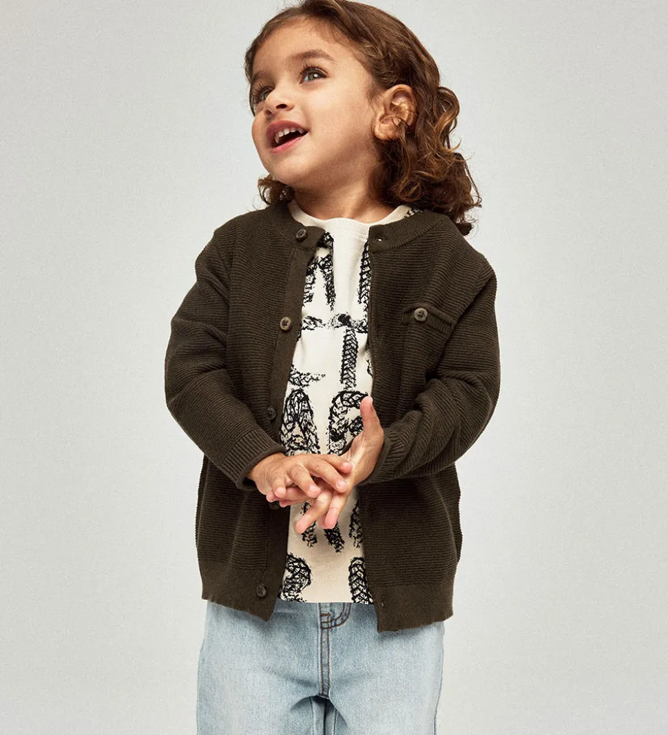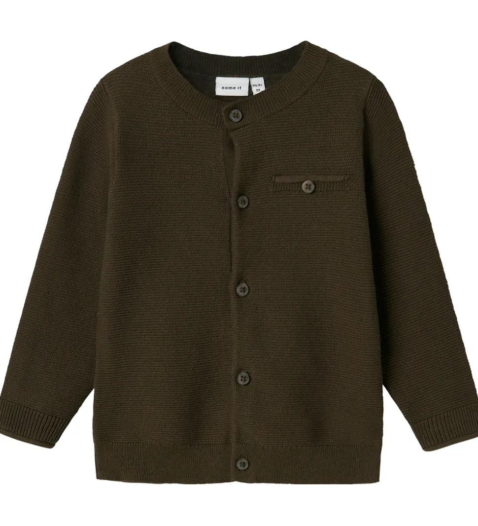 Flot Name It cardigan i brun med en flot strikket struktur. Cardiganen har lange ærmer og gennemgående knapper fortil. Name It cardiganen er designet med en enkelt brystlomme og ribkanter i alle åbninger.