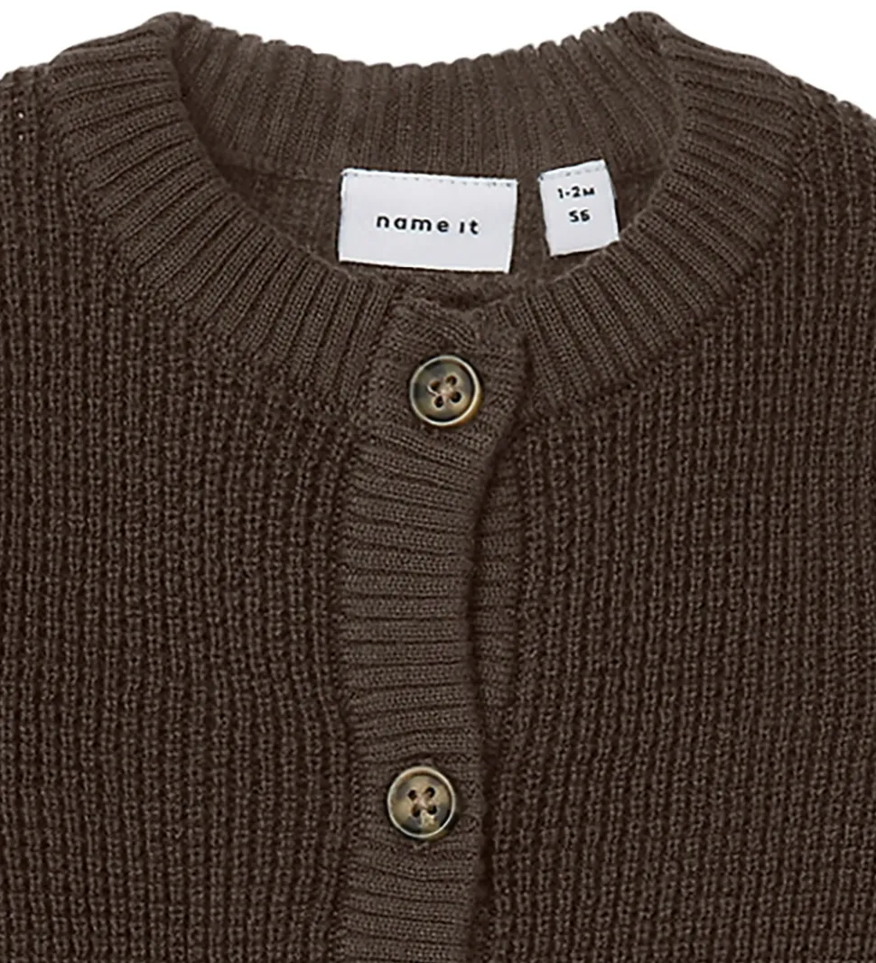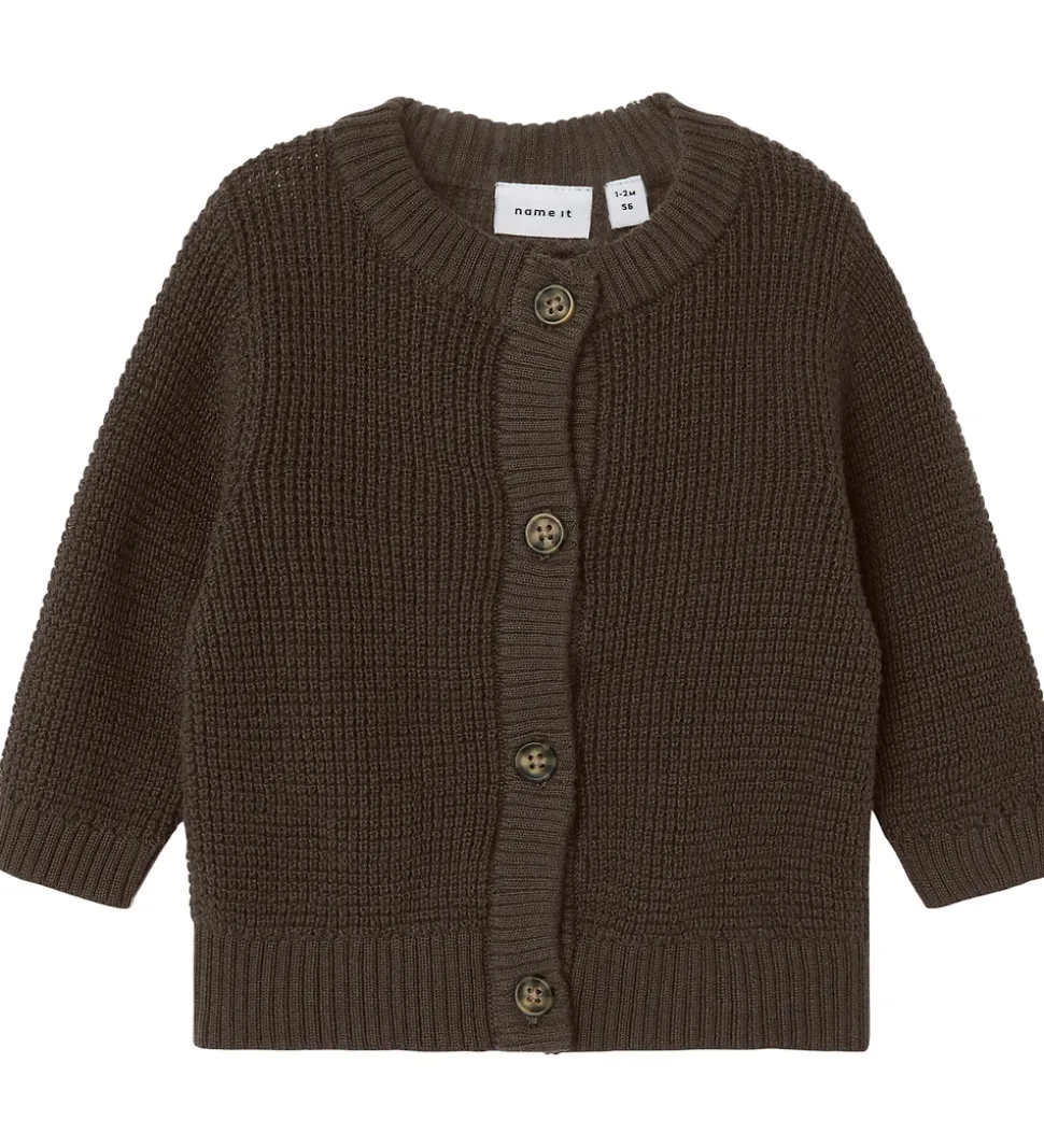 Flot Name It cardigan i en dyb brun nuance. Cardigan har en strikket struktur med gennemgående knapper fortil. Den har en rund halsudskæring og lange ærmer. Cardiganen har ribkanter i alle åbninger, som sikrer en behagelig pasform.