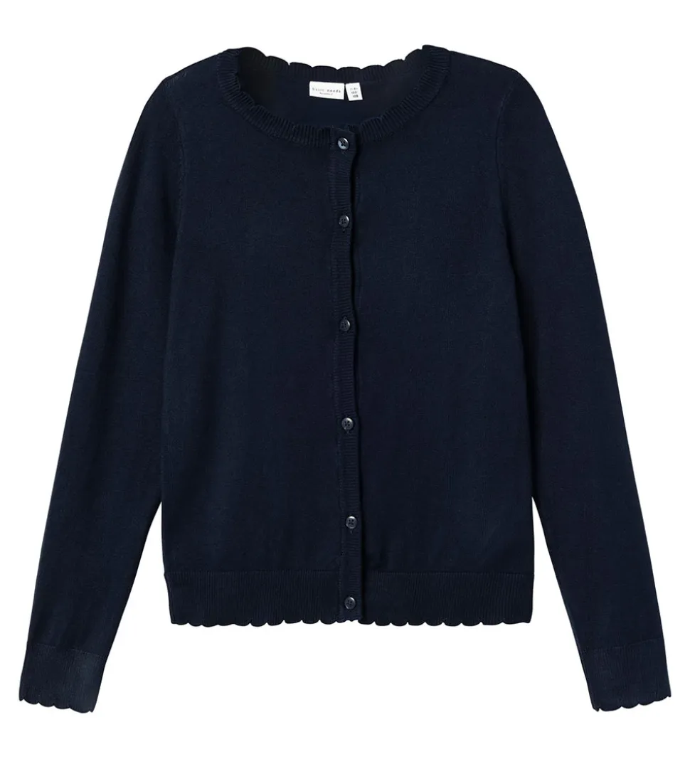 Flot Name It cardigan i en navy strikstruktur, med bølgede kanter i alle åbninger.