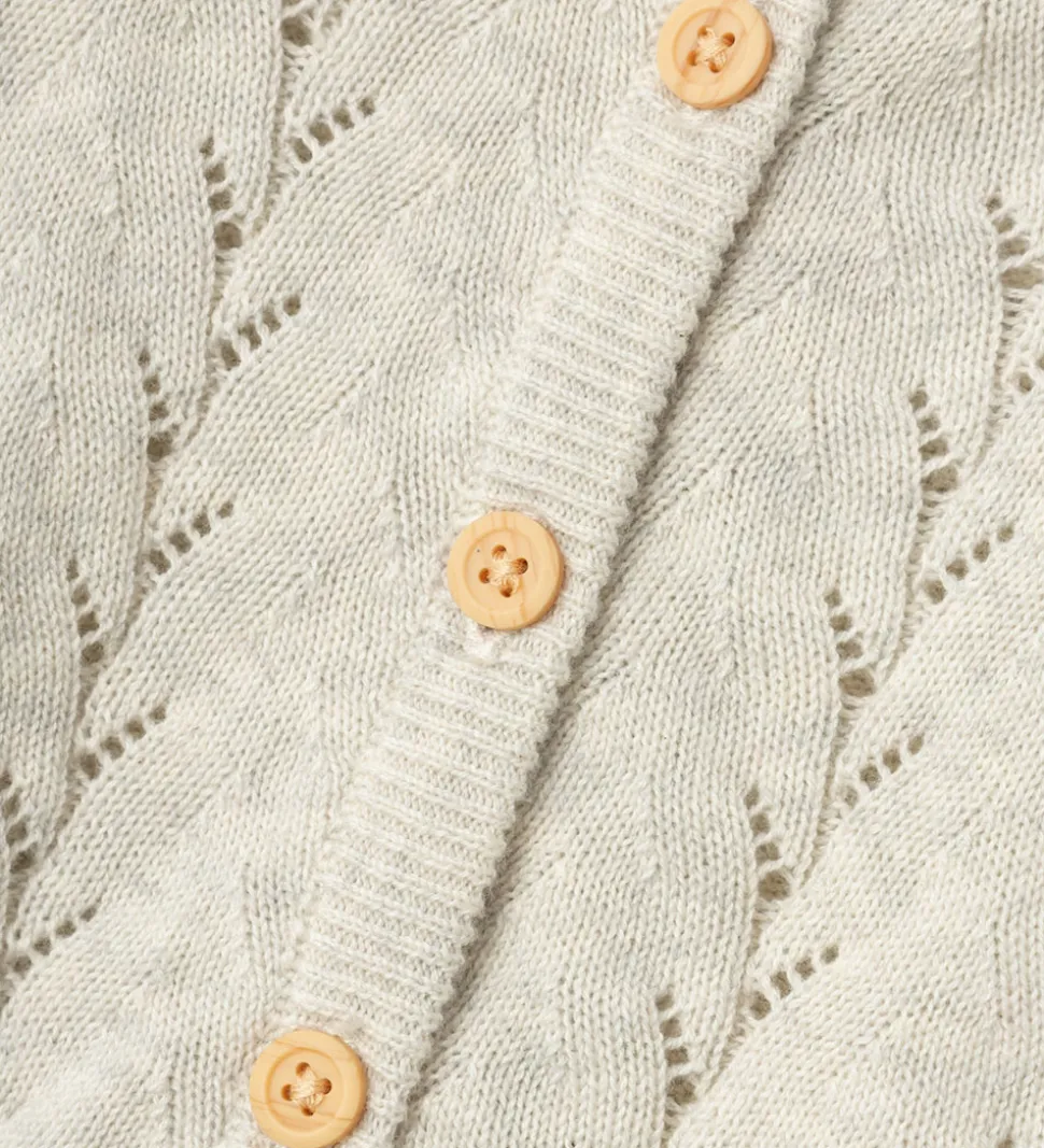 Lækker Name It cardigan i meleret beige strik, med et flot hulmønster.