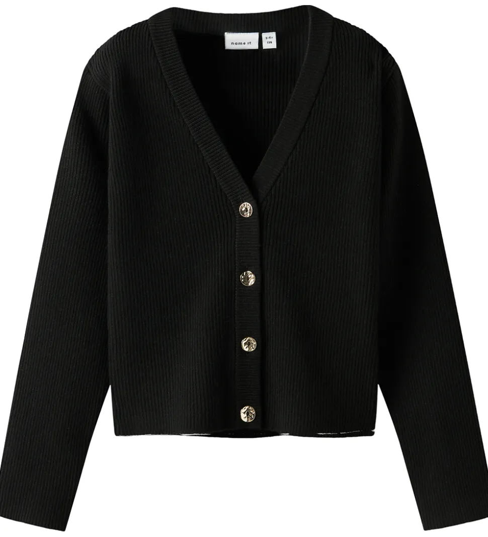 Stilfuld Name It cardigan i klassisk sort med ribstruktur over hele materialet.