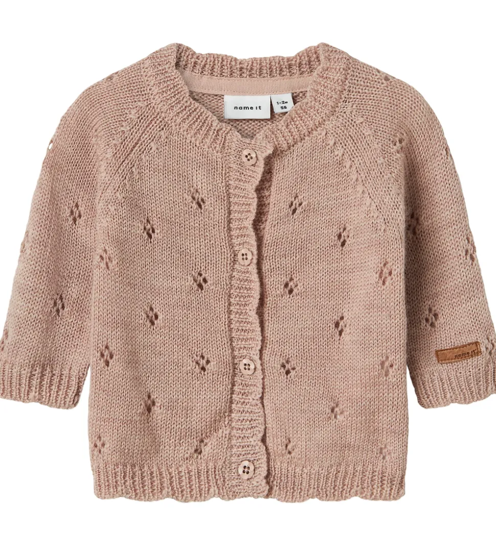 Smuk Name It cardigan i en sart, rosa nuance med et delikat hulmønster. Cardiganen fra Name It har lange ærmer og en rund halsudskæring, som tilfører et klassisk look. Den er udstyret med fine knapper langs fronten og har en blød ribkant ved ærmerne og nederst.