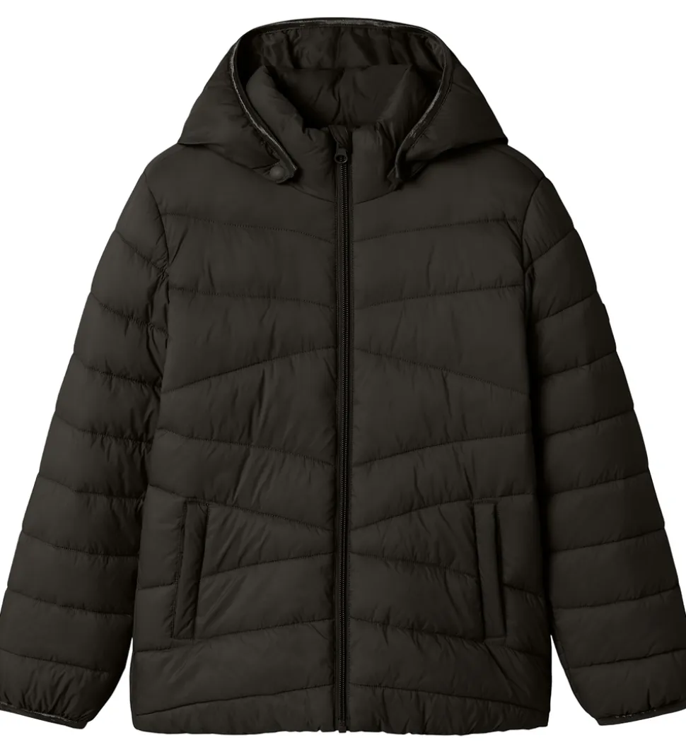 Smart Name It dynejakke i en klassisk sort farve. Dynejakken har et enkelt og stilrent design med vandrette syninger, der skaber en let struktur. Den har en praktisk aftagelig hætte og lange ærmer, som gør den velegnet til køligere dage.