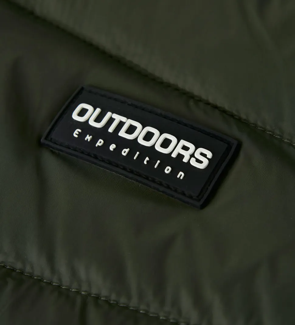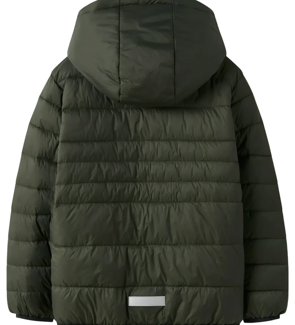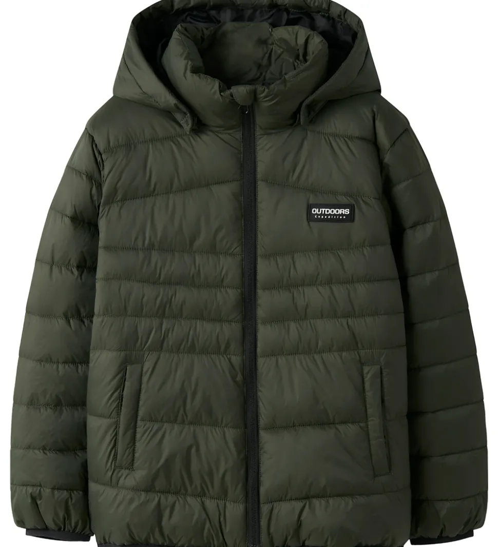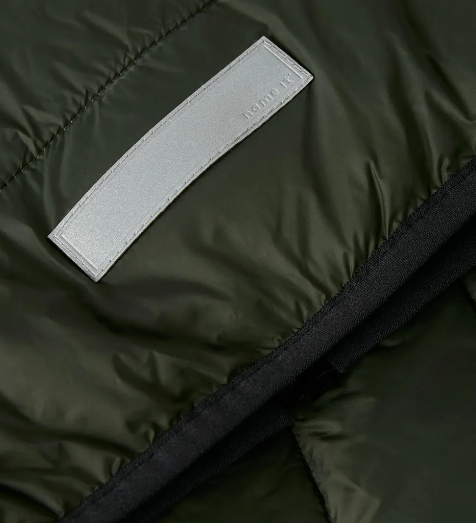 Flot Name It dynejakke i mørkegrøn med et diskret firkantet logo på venstre bryst. Dynejakken har vandrette syninger, der skaber en ensartet overflade.
