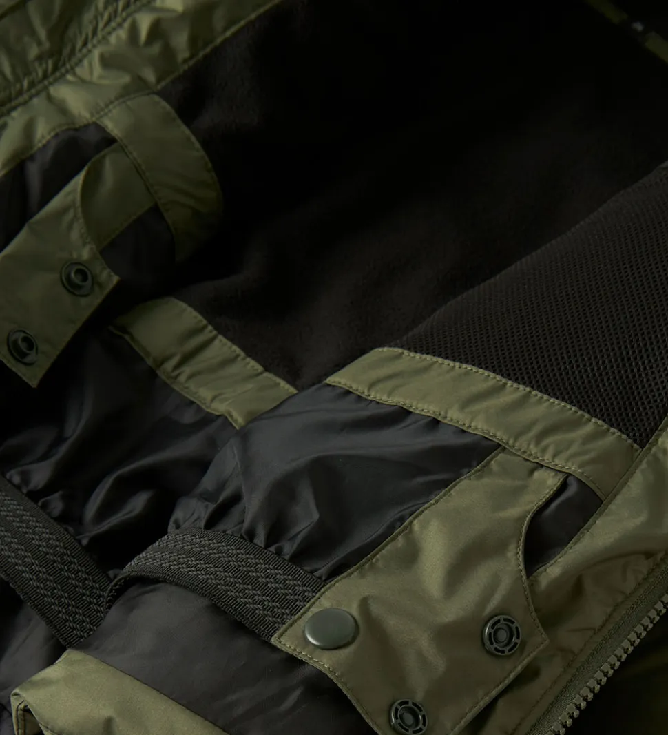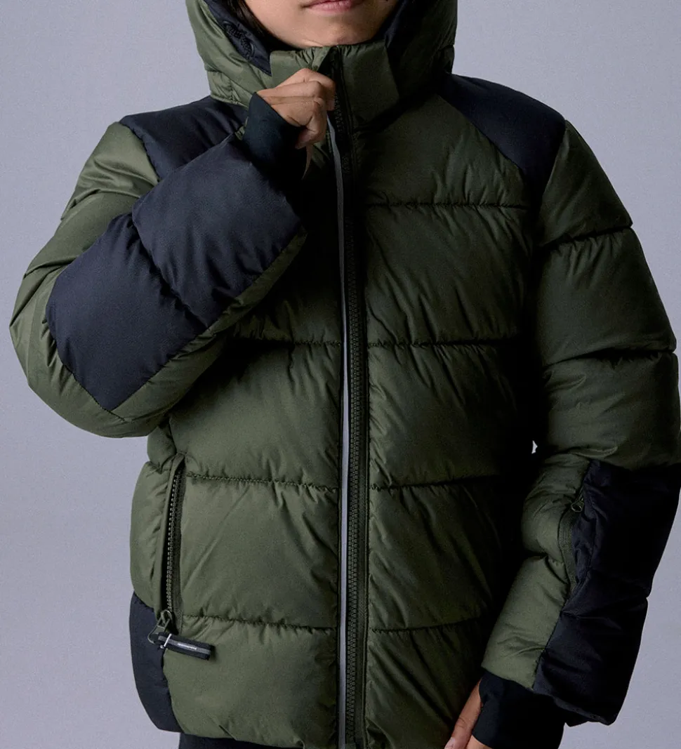 Dynejakken åbnes fortil ved hjælp af en lynlås med hagebeskytter og indvendig vindstolpe. I livåbningen er der snefang med trykknapslukning, elastikkant og gummibelægning på indersiden. På fronten er der to sidelommer med lynlås, og i venstre ærme er der en skjult lynlåslomme.