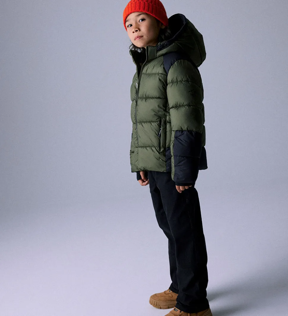 Name It dynejakken har en aftagelig hætte, som fæstnes omkring halskraven med trykknapper og velcro. Ærmerne er med snefang og brede, strækbare kanter med hul til tommelfingeren.