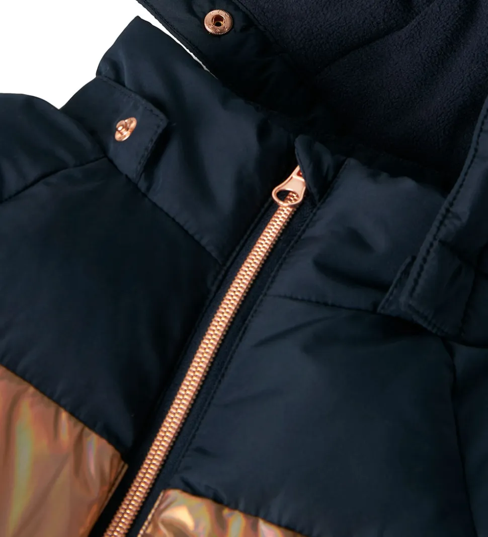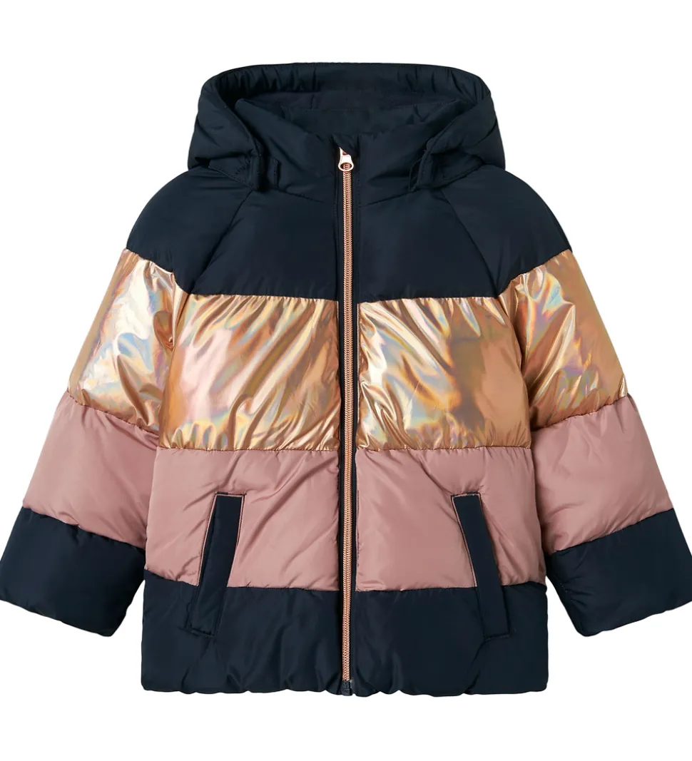 Lækker Name It dynejakke med brede striber i navyblå, rosa og skinnende guld. Dynejakken er med vandrette syninger.