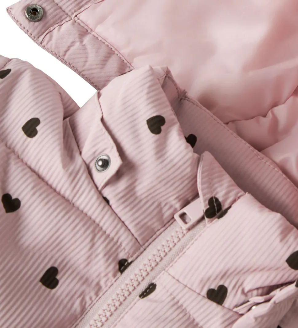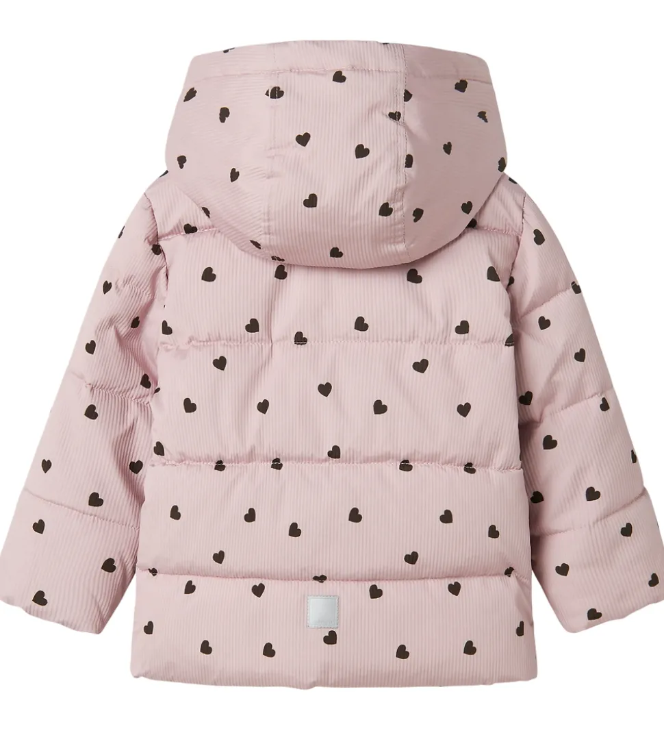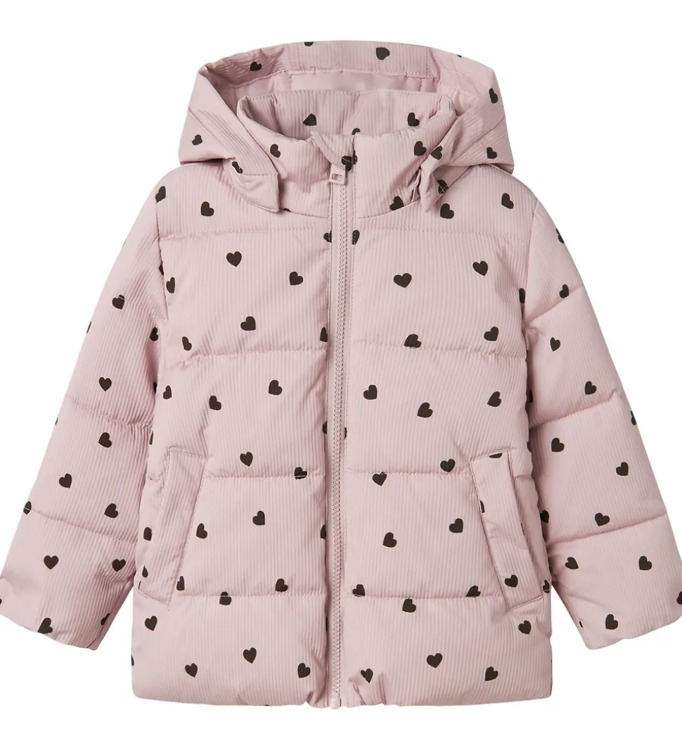 Flot Name It dynejakke i en blød, lys, lilla farve med et alloverprint af mørke hjerter samt en diskret, stribet struktur og vandrette syninger.