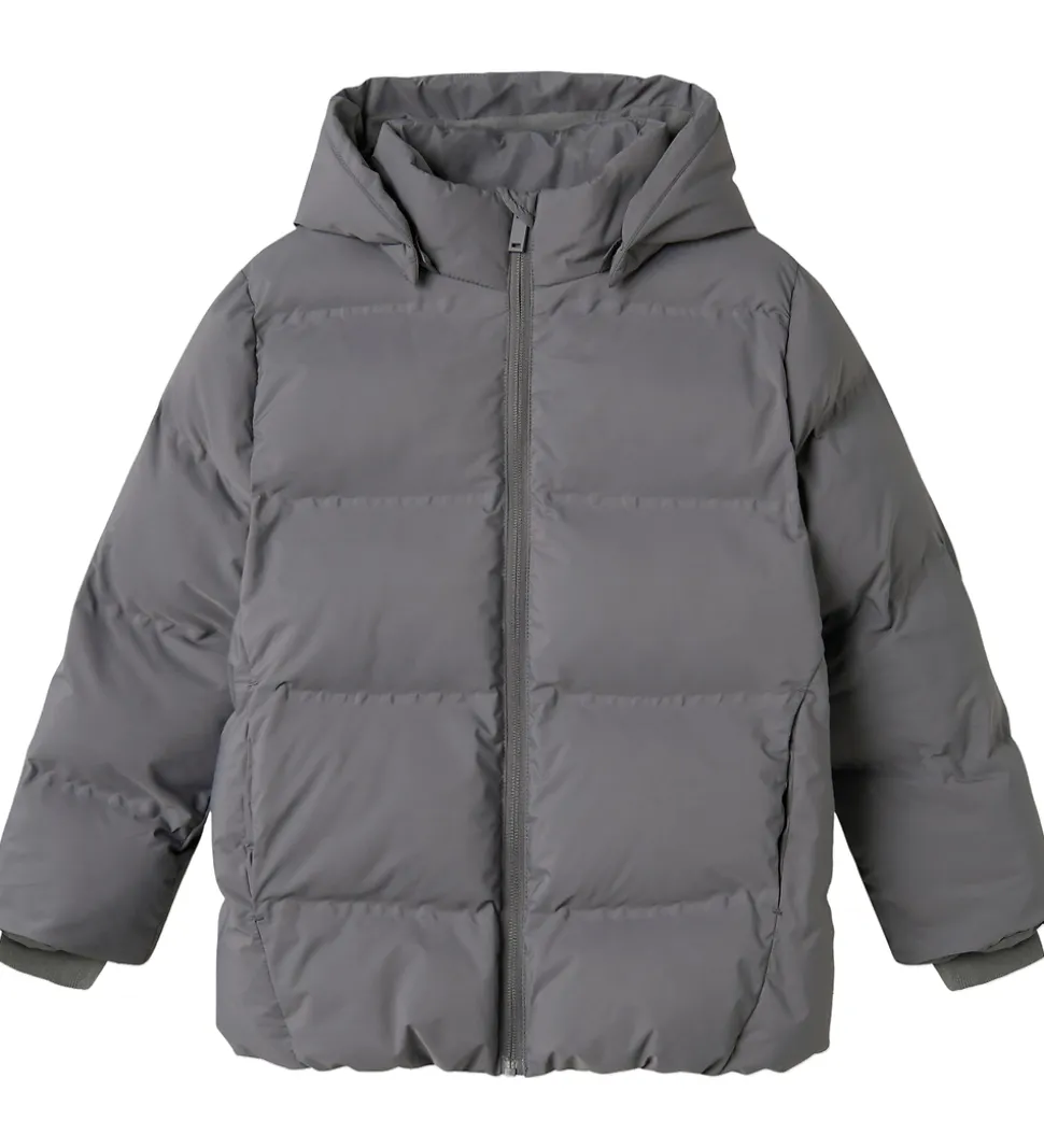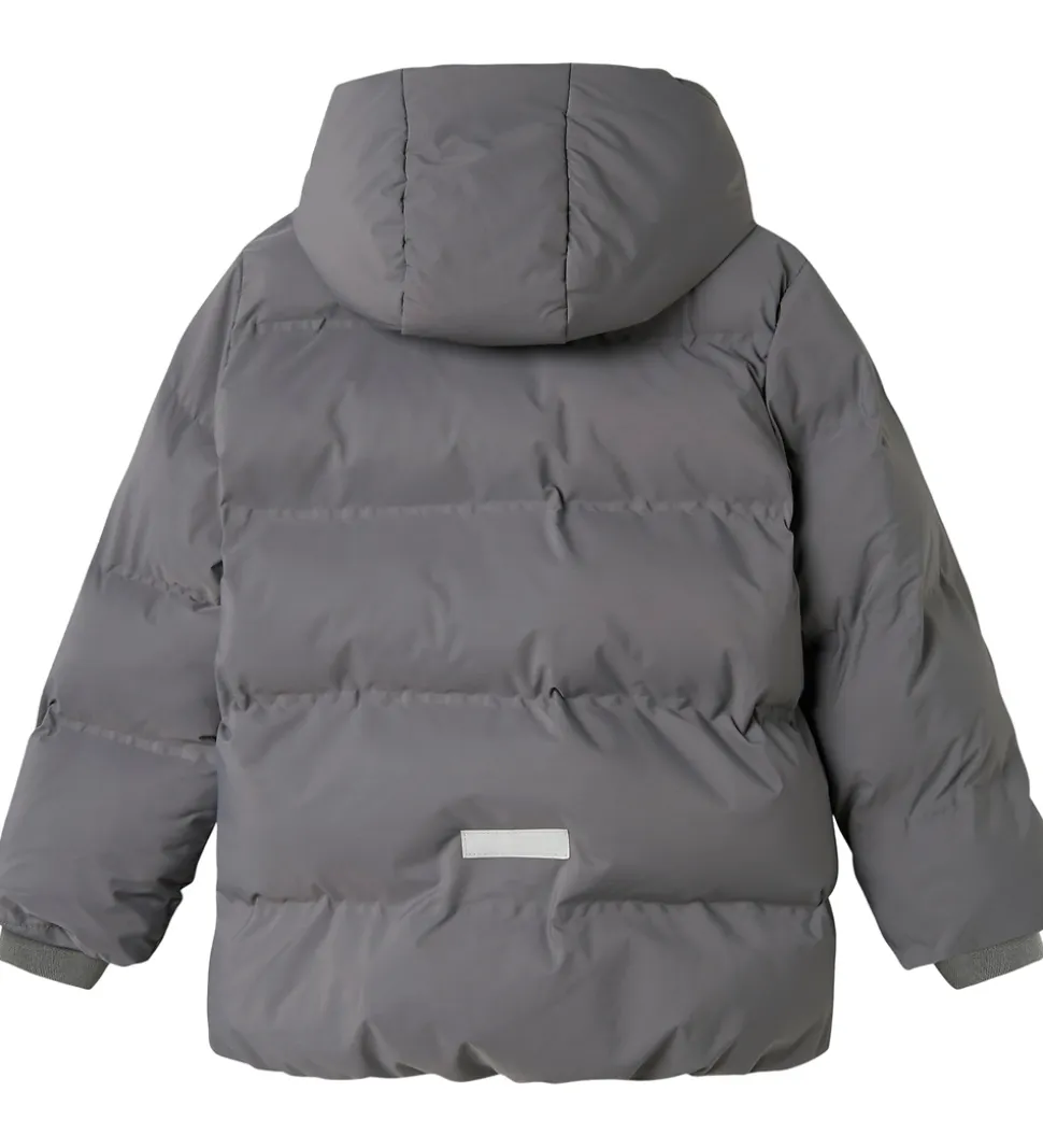 Flot Name It dynejakke i grå med en indpræget struktur i vandrette linjer. Dynejakken er med praktiske reflekser.
