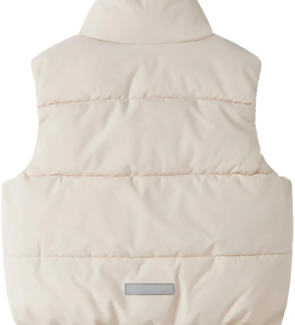 Name It dynevesten har en høj hals, og den har indvendige elastikkanter. Dynevesten lukkes med en lynlås med hagebeskytter og indvendig vindstolpe, og i siderne er der praktiske klaplommer. Dynevesten har et glatvævet for, og den har en lun polyestervattering. Nederst på ryggen sidder der en refleks.