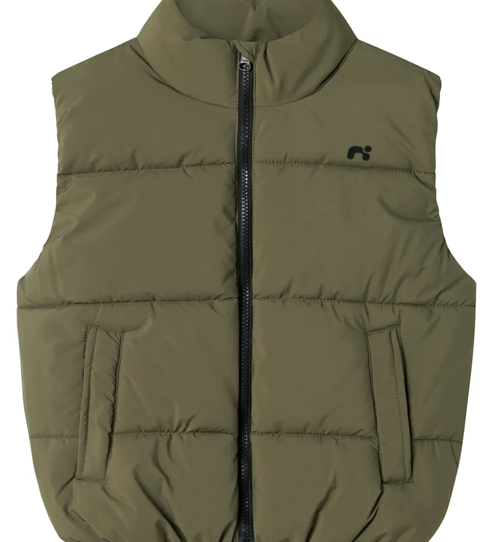 Skøn Name It dynevest i støvet olivengrøn med vandrette syninger og et lille logo på venstre bryst.