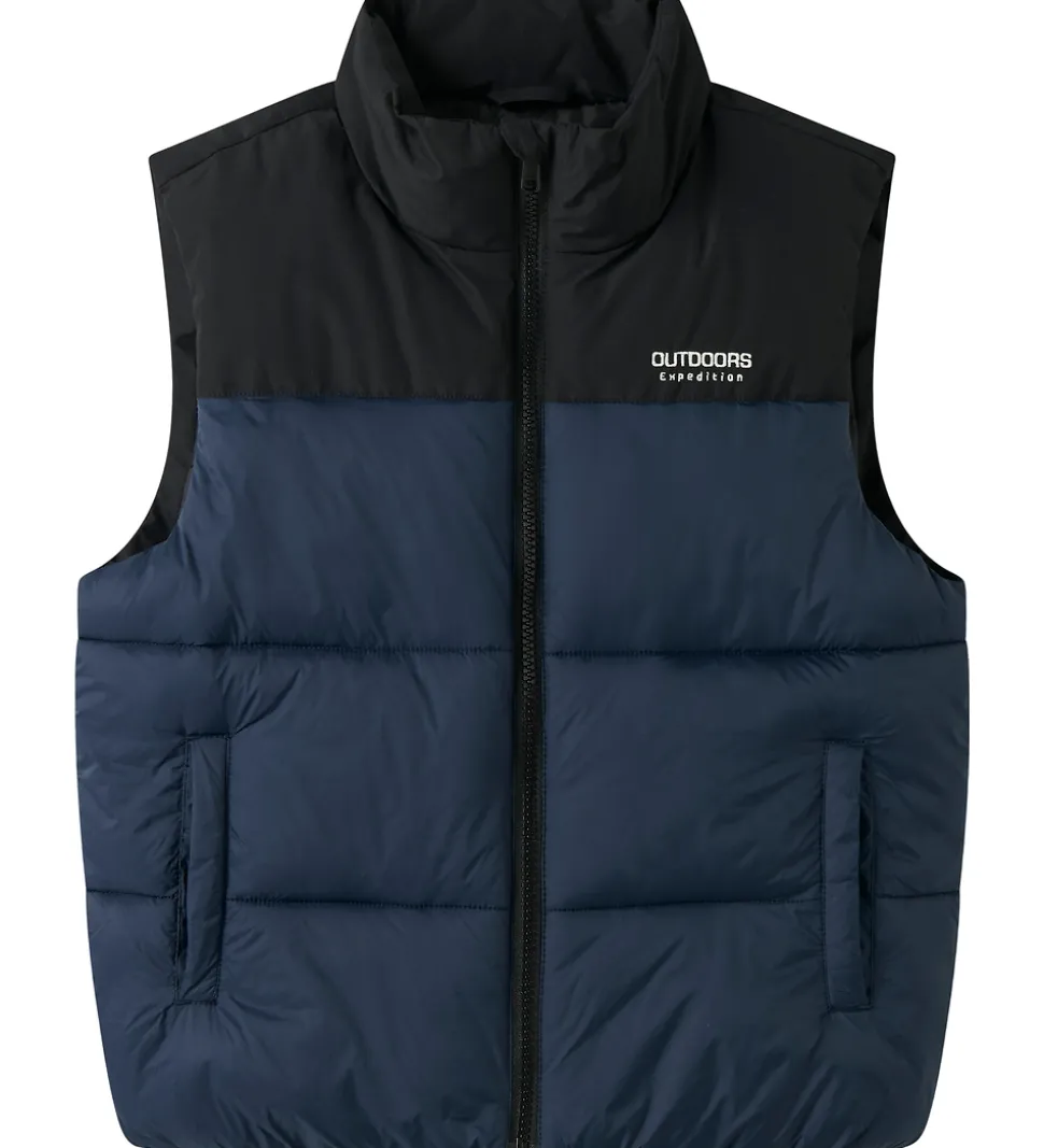 Lækker Name It dynevest i en flot kombination af sort og mørkeblå med et hvidt “OUTDOORS expedition” logo på brystet.