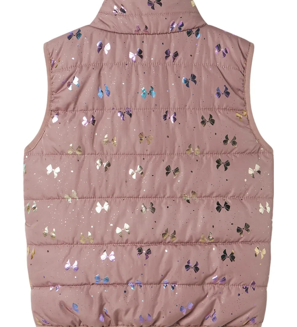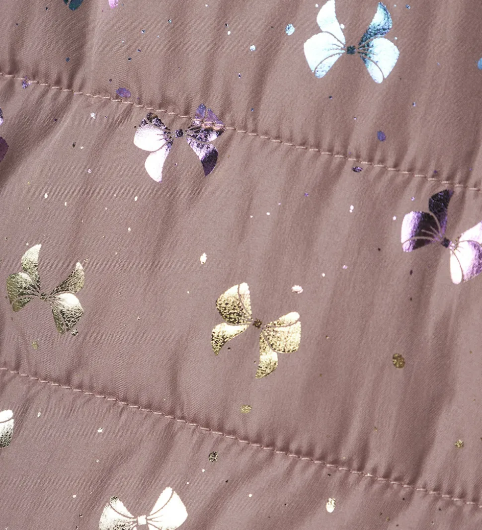 Attraktiv Name It dynevest i en blød rosa nuance med et metallisk print med sløjfer som changerer i guld og lilla.