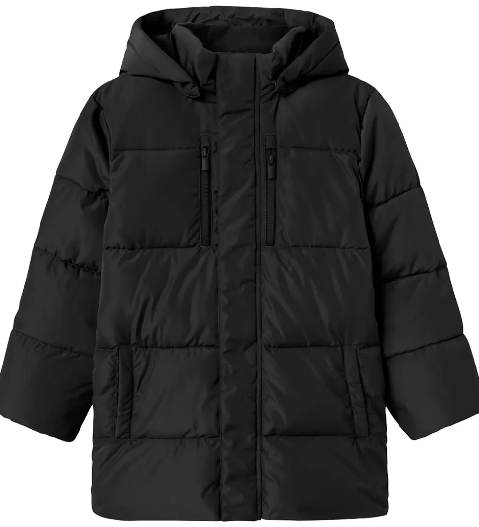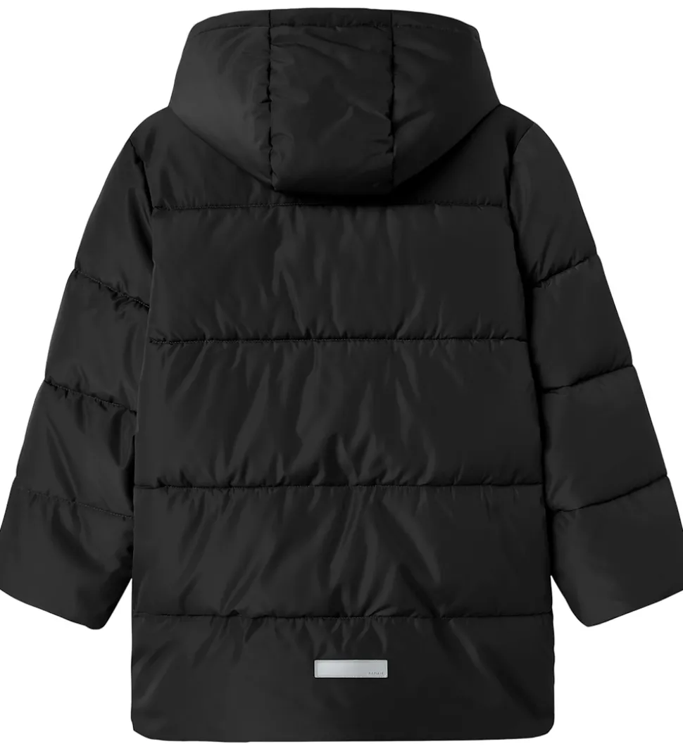 Lækker Name It dynejakke i sort med vandrette syninger. Dynejakken har en praktisk refleks nederst på ryggen.