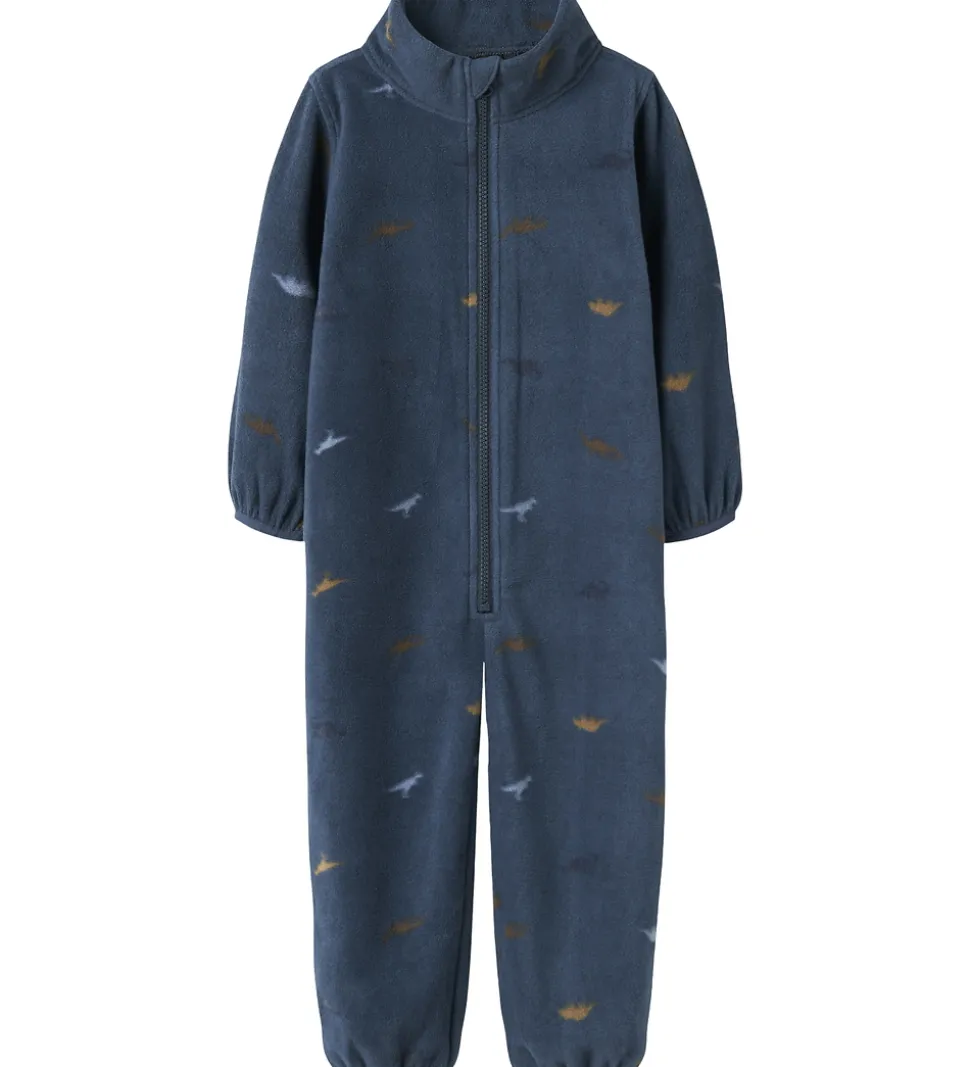 Bhagelig Name It fleecedragt i en flot mørkeblå farve med et diskret mønster af små dinoer i forskellige nuancer.
