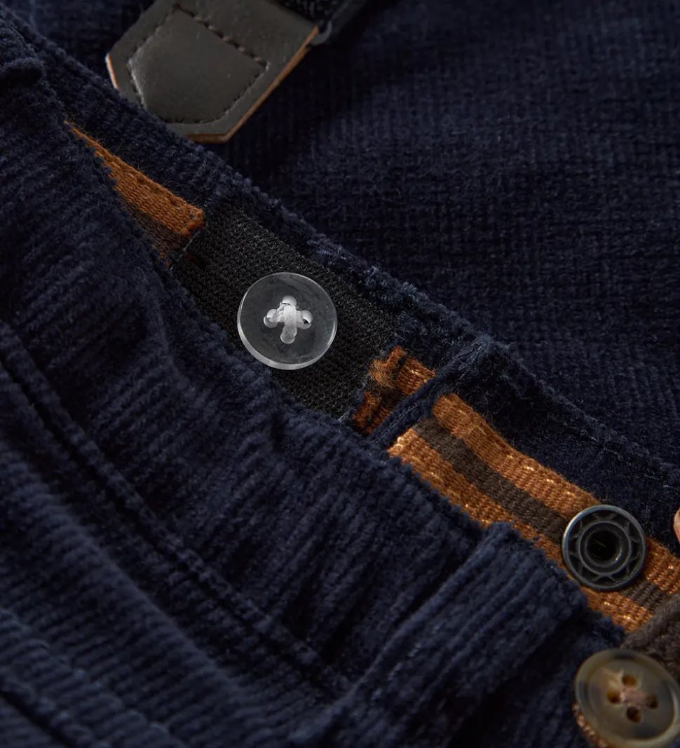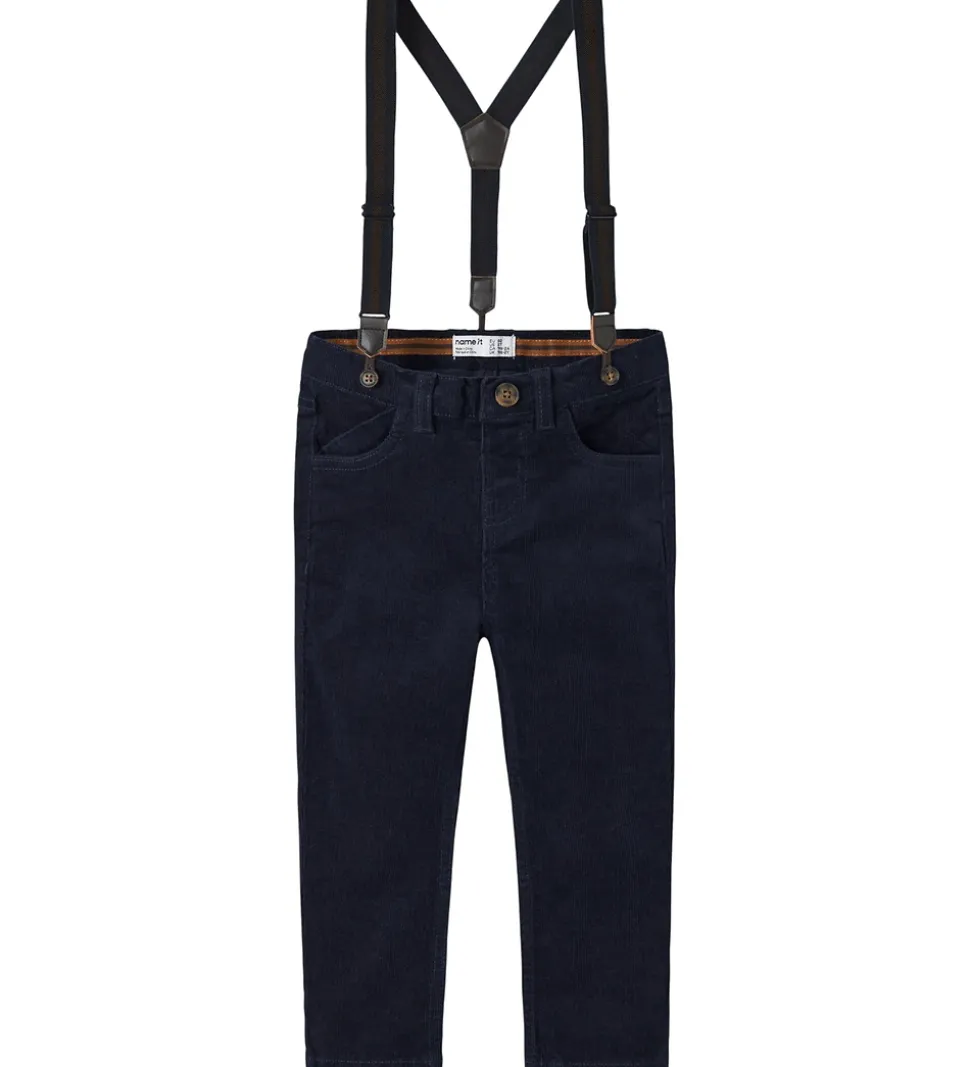 Smukke Name It fløjlsbukser i en dyb marineblå nuance. Name It fløjlsbukserne har en blød fløjlsstruktur og er forsynet med justerbare, aftagelige seler for ekstra stil. Fløjlsbukserne har en praktisk lukning med en enkelt knap og lynlås samt en indvendigt justerbar buksekant, der sikrer en god pasform.