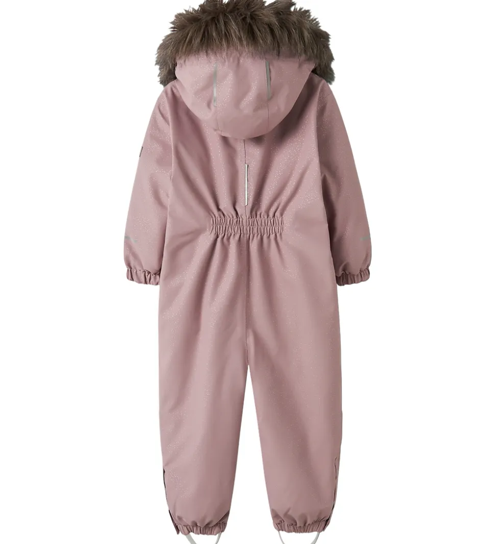 Name It flyverdragten har en aftagelig hætte, som sidder fast med skjulte trykknapper, og den har en flot kant af imiteret pels, som sidder fast med trykknapper. Hættens ansigsåbning har også en indvendig elastikkant af fleece. Ærmerne og benene har elastikkanter, og der er aftagelige, justerbare gummistropper til at sætte under støvlerne. Benåbningerne kan løsnes lidt ved hjælp af velcro og en trykknap.