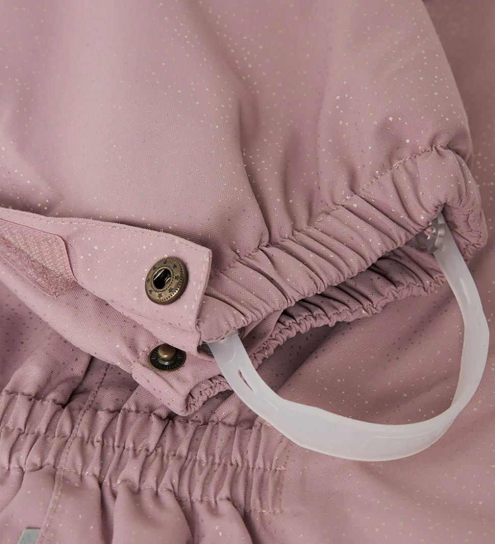 Dejlig Name It flyverdragt i støvet rosa med guldprikker over det hele. På tværs af brystet er der en sød flæsekant.