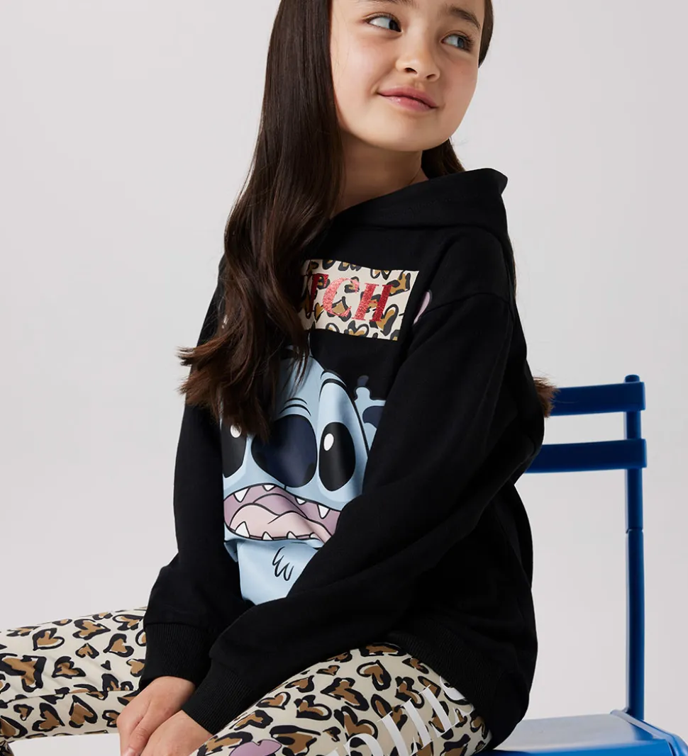 Flot hættetrøje fra Name It i sort med et stort og farverigt print af Stitch med et markant smil. Over grafikken står “STITCH” med røde bogstaver på en baggrund med leopardmønster. Hættetrøjen fra Name It har en blød hætte samt ribkanter ved ærmer og nederst.
