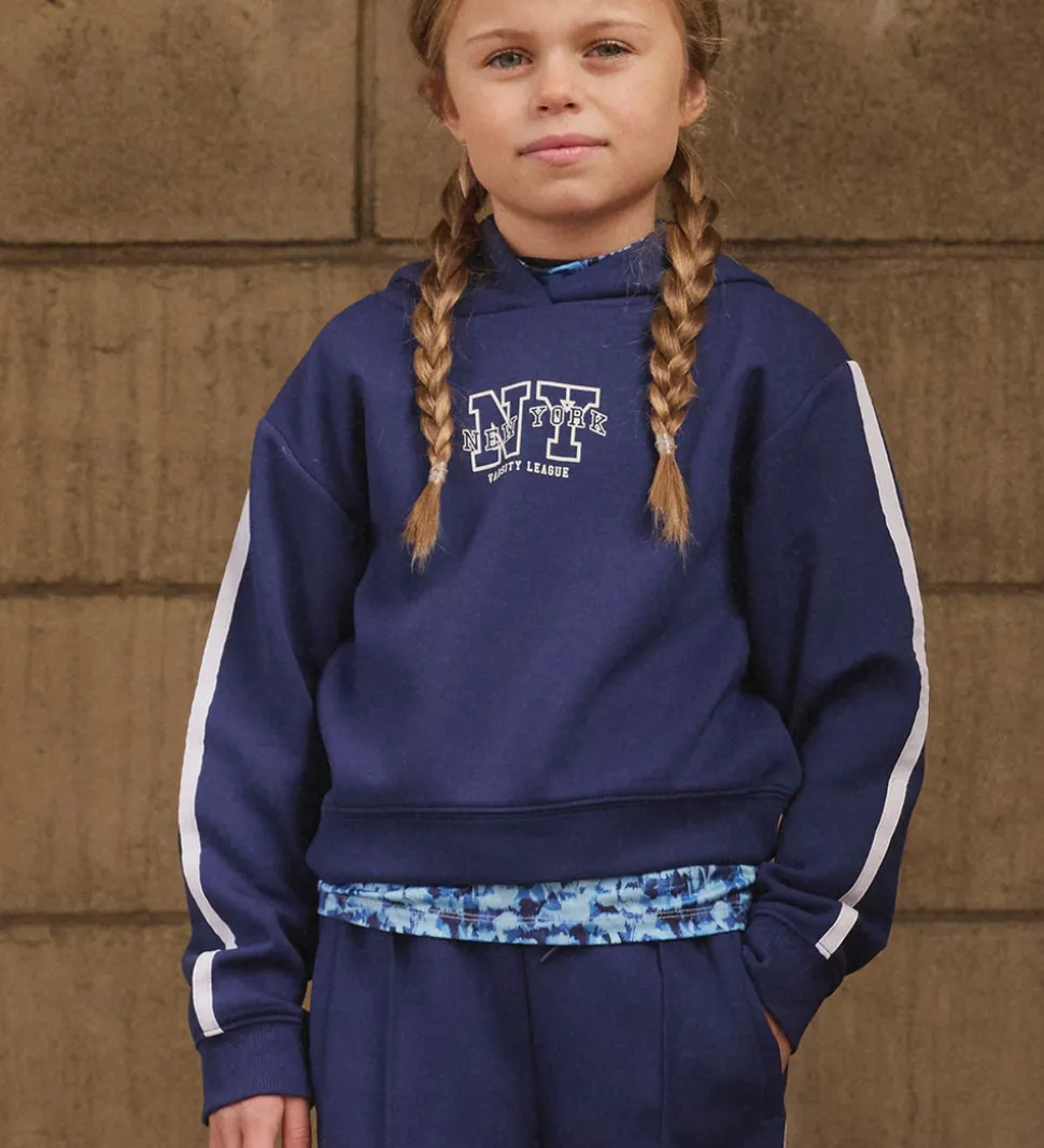 Smart Name It hættetrøje i en dyb blå farve. Hættetrøjen har et markant hvidt tryk på brystet med teksten “New York Varsity League”. Langs ærmerne ses en kontraststribe, der tilføjer et moderne touch. Name It hættetrøjen har ribkanter ved håndleddene og i bunden for optimal pasform. Hættetrøjen er fremstillet i en lækker blød, sporty kvalitet.