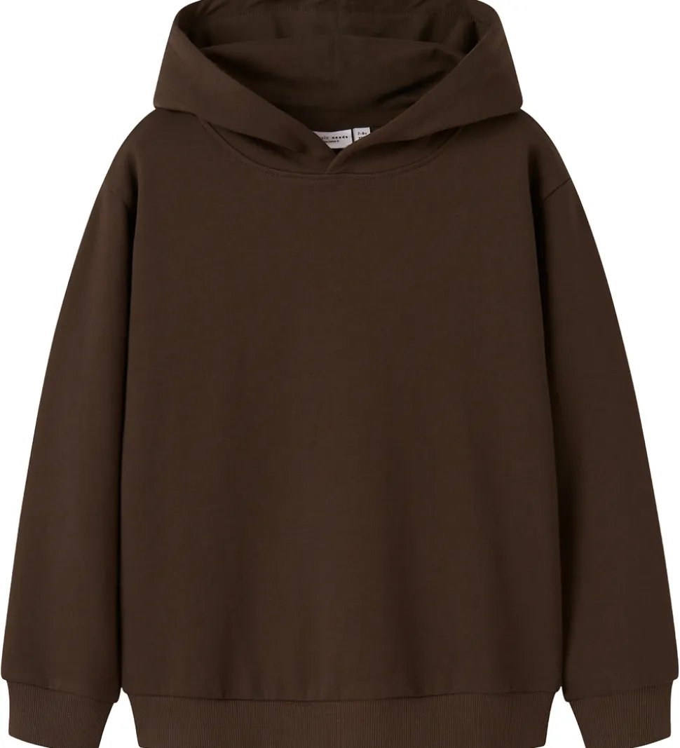 Stilren Name It hættetrøje i en dyb, mørkebrun farve. Hættetrøjen har en klassisk hætte og ribkanter ved ærmerne og nederst, som giver et afslappet look. En funktionel tilføjelse til garderoben.