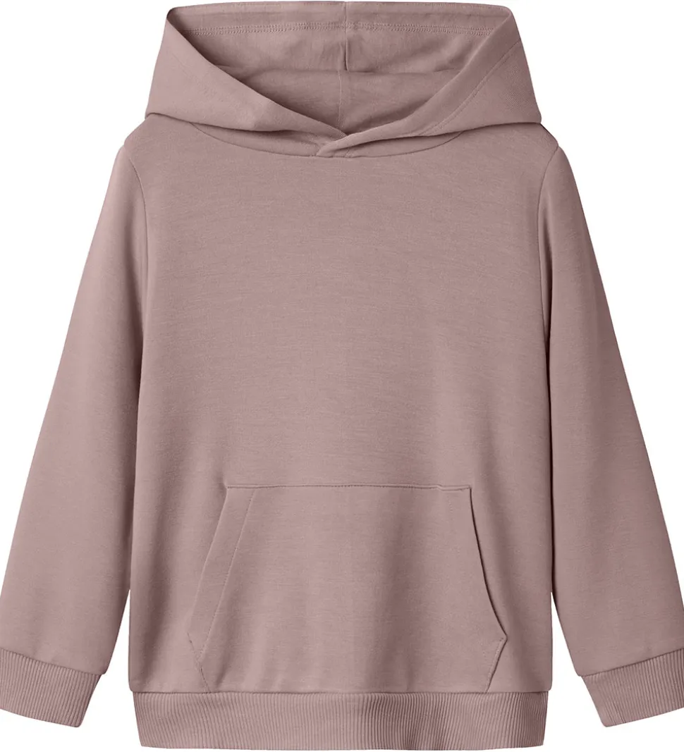 Skøn Name It hættetrøje i støvet rosa. Hættetrøjen har lange ærmer og en fastsyet, blød hætte. På maven er der en stor kængurulomme. Sweatshirten er fremstillet i en meget blød kvalitet, som er behagelig at have på.