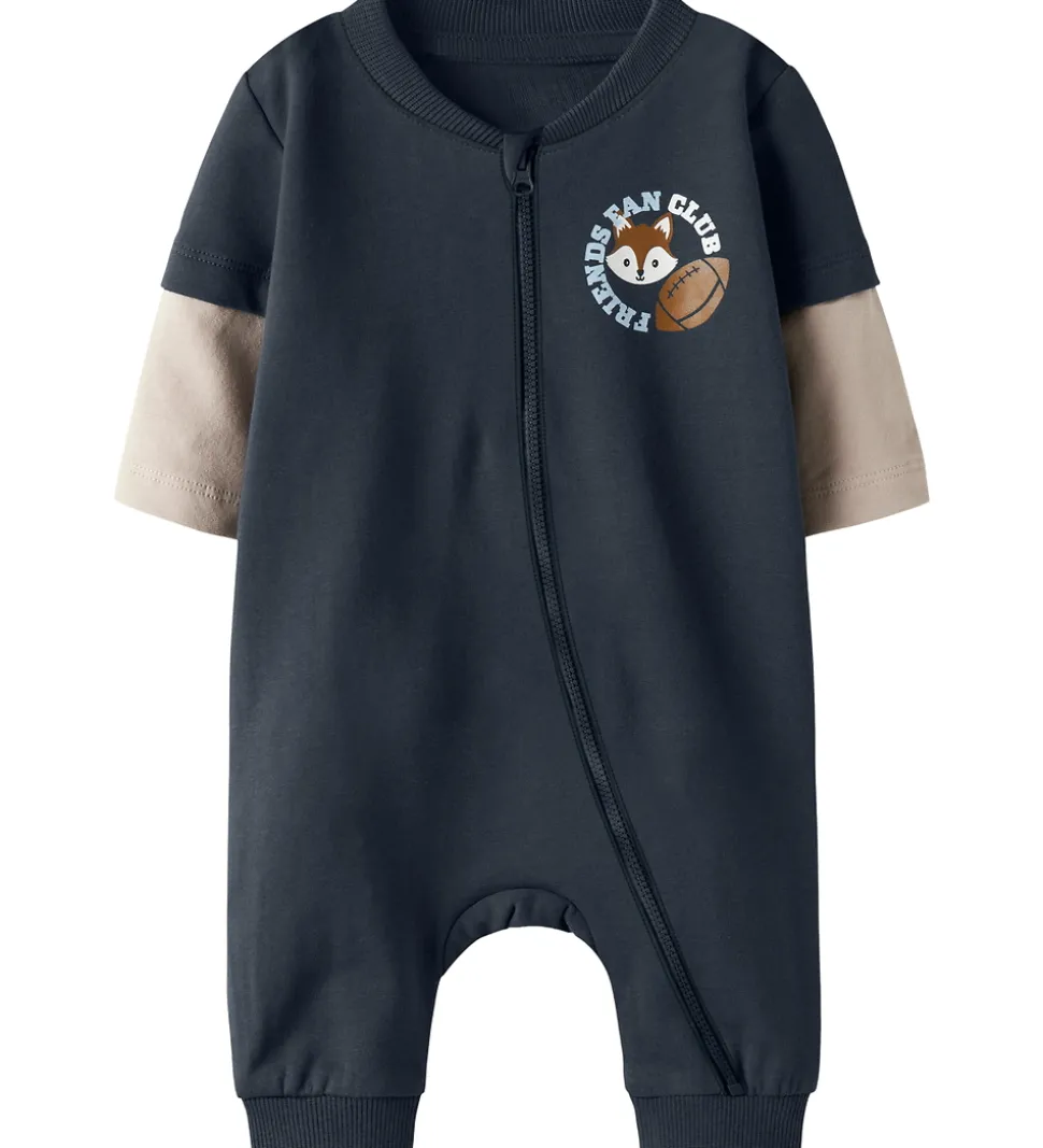 Flot heldragt fra Name It i en enkel, mørkeblå farve med kontrasterende beige ærmer. Et sødt motiv pryder brystet med teksten “Friends Fan Club”.