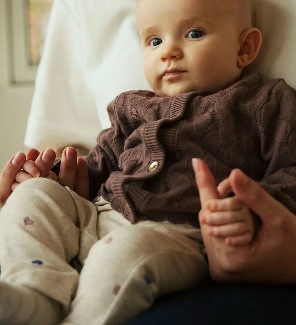 Charmerende Name It heldragt i en meleret beige ribkvalitet og med et allover hjertemønster i blå, rosa og mørkebrun. Name It heldragten lukkes med skjulte trykknapper over venstre skulder og hele vejen mellem benene. Den runde halsudskæring har en dekorativ, smal blondekant.