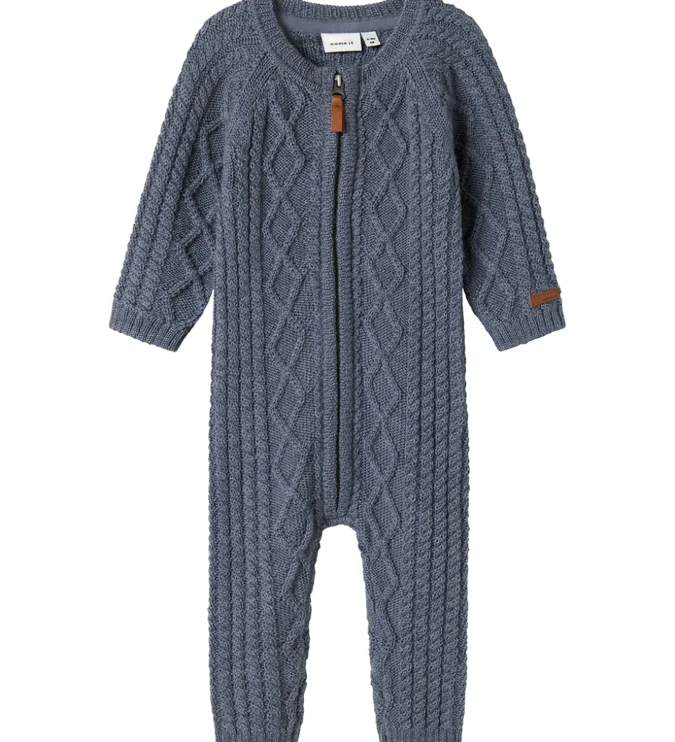 Flot Name It heldragt i en dyb, gråblå nuance med et karakteristisk strikmønster. Dragten har et elegant flettemønster, som giver den et unikt udtryk.