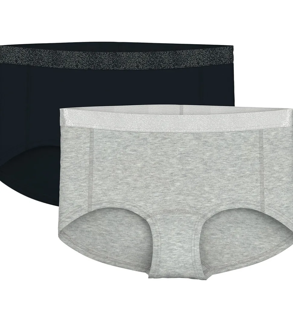 Praktiske Name It hipsters solgt i en pakke med to par i gråmeleret og sort. Begge hipsters har elastik i sølv glimmer i livet, der giver en god pasform. Name It hipstersene er ideelle til enhver garderobe.