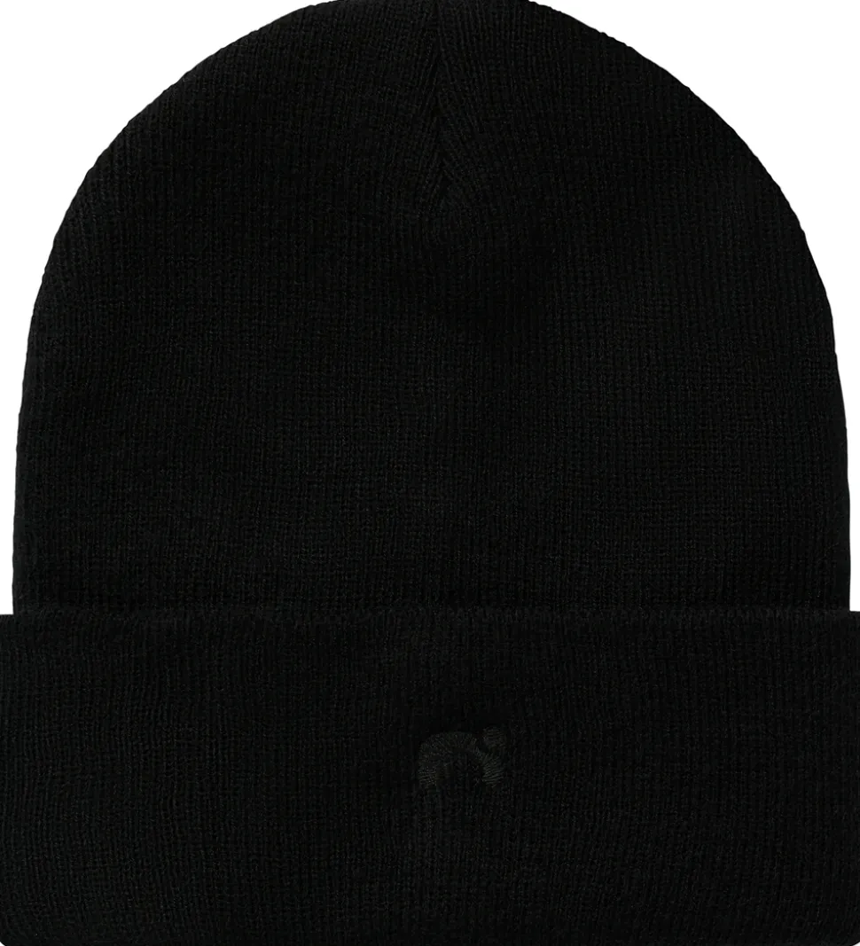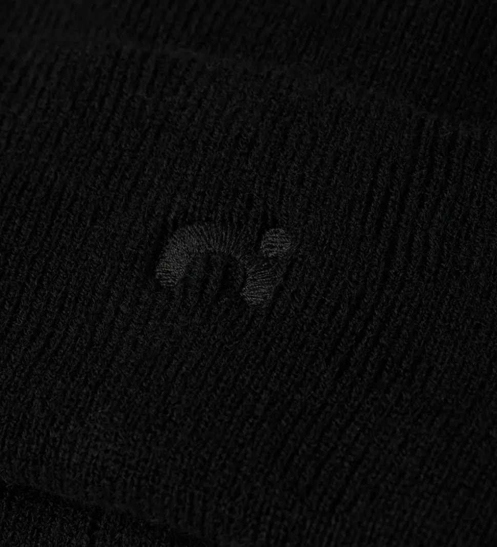 Smart Name It hue i sort strik med et diskret, broderet logo på fronten. Huen består af to lag med vindblokering ved ørerne, som beskytter ørerne mod kold vind. Huen har en rund hovedform med et bredt ombuk nederst.
