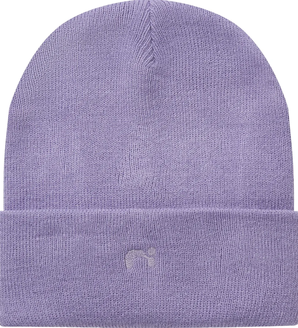 Fin Name It hue i lilla strik med et diskret, broderet logo på fronten. Huen består af to lag med vindblokering ved ørerne, som beskytter ørerne mod kold vind. Huen har en rund hovedform med et bredt ombuk nederst.