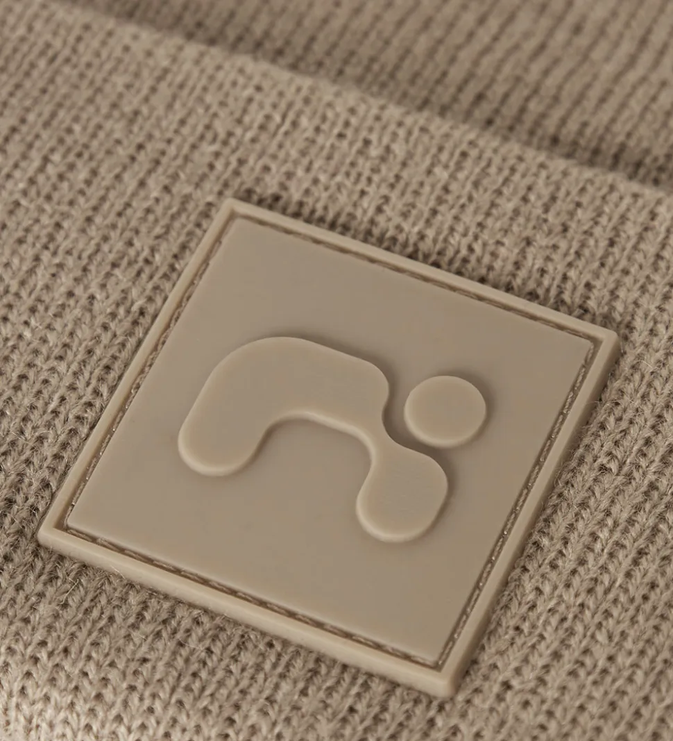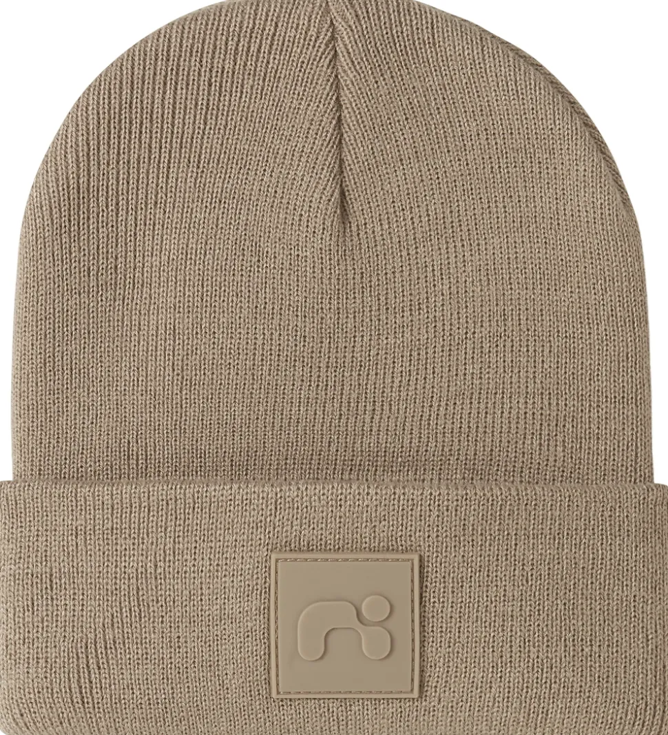 Lækker Name It hue i lysebrun med et diskret gummilogo på fronten. Huen har en flot ribstrikket struktur, og en rund hovedform med et bredt ombuk forneden.