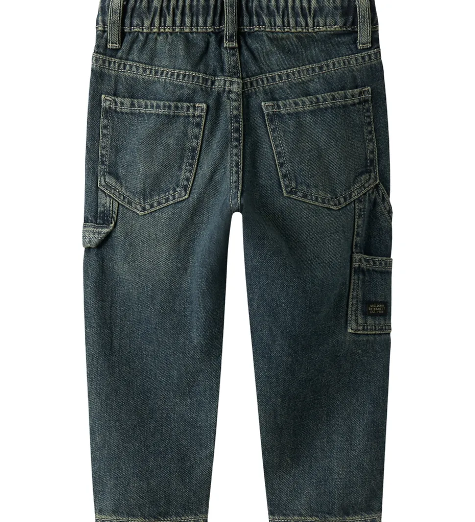 Praktiske Name It jeans i blå denim med vasket look. Name It jeansene har en elastisk talje, som kan justeres med knapper indvendigt. De har praktiske bæltestropper og lommer foran, bagpå og i højre side.