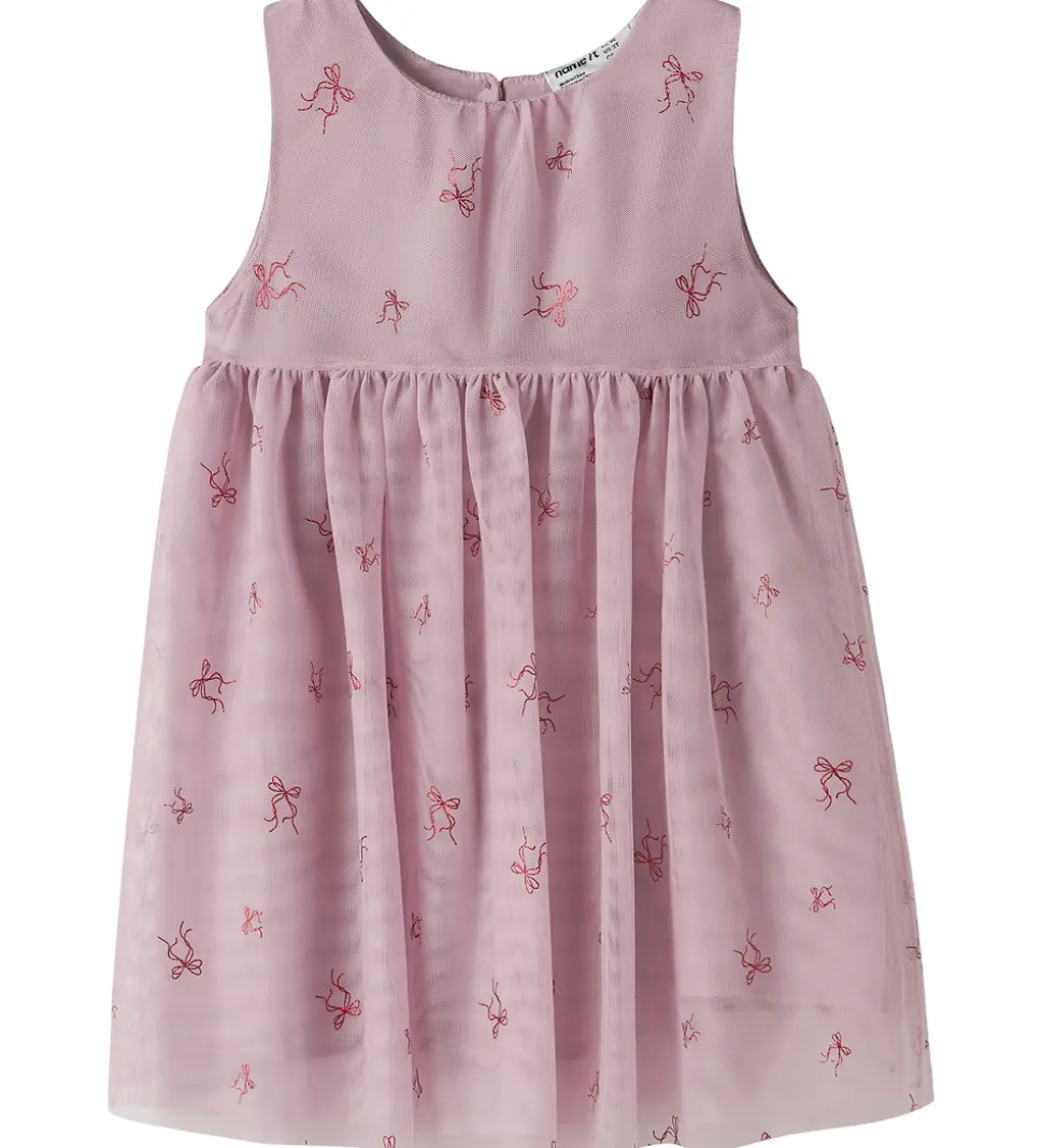 Fin Name It kjole i rosa med print af små sløjfer i rød glimmer. Name It kjolen er ærmeløs, og har en rund halsudskæring med en knap i nakken. Kjolen består af et lag genanvendt polyester inderst og to lag tyl yderst.