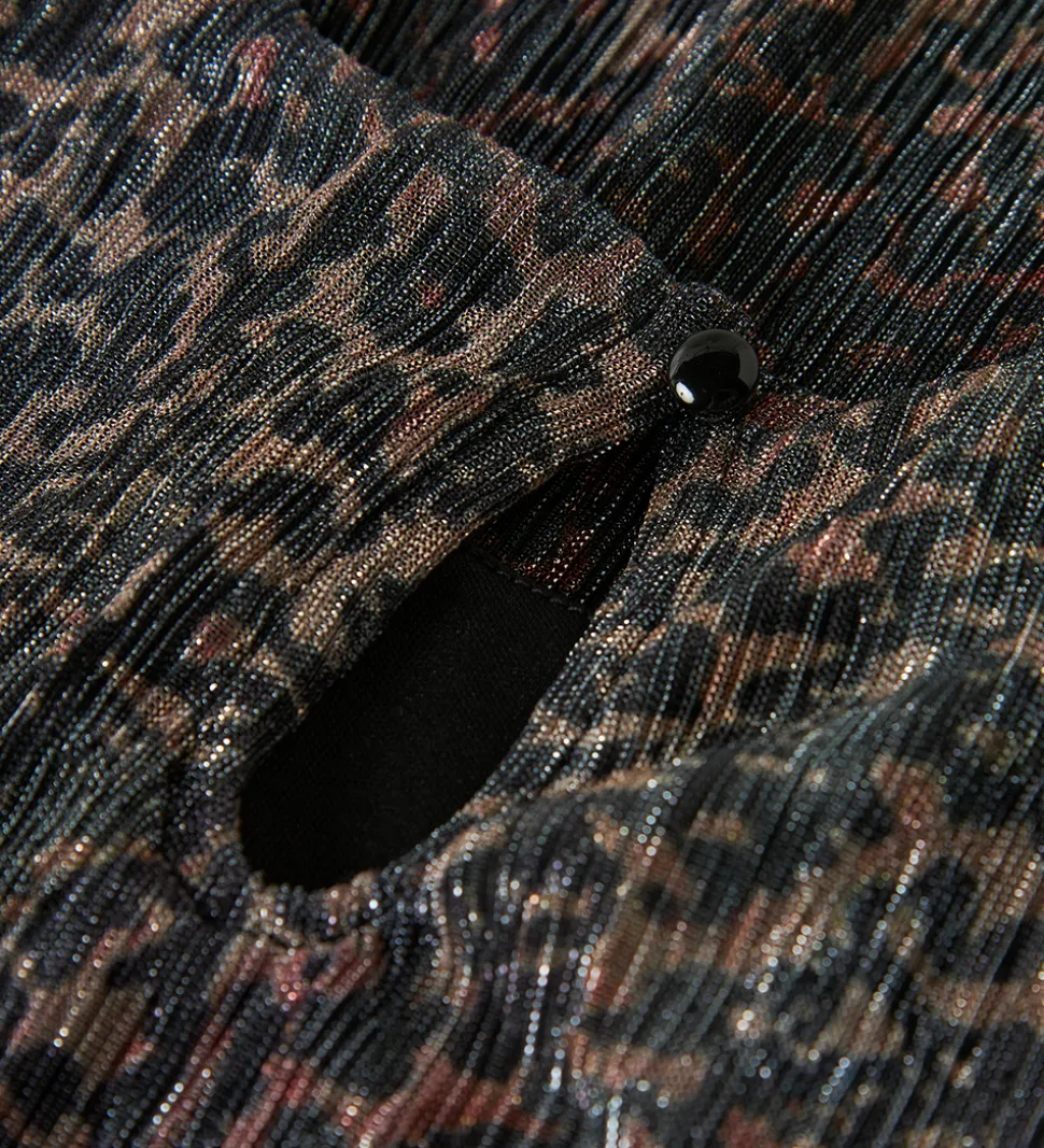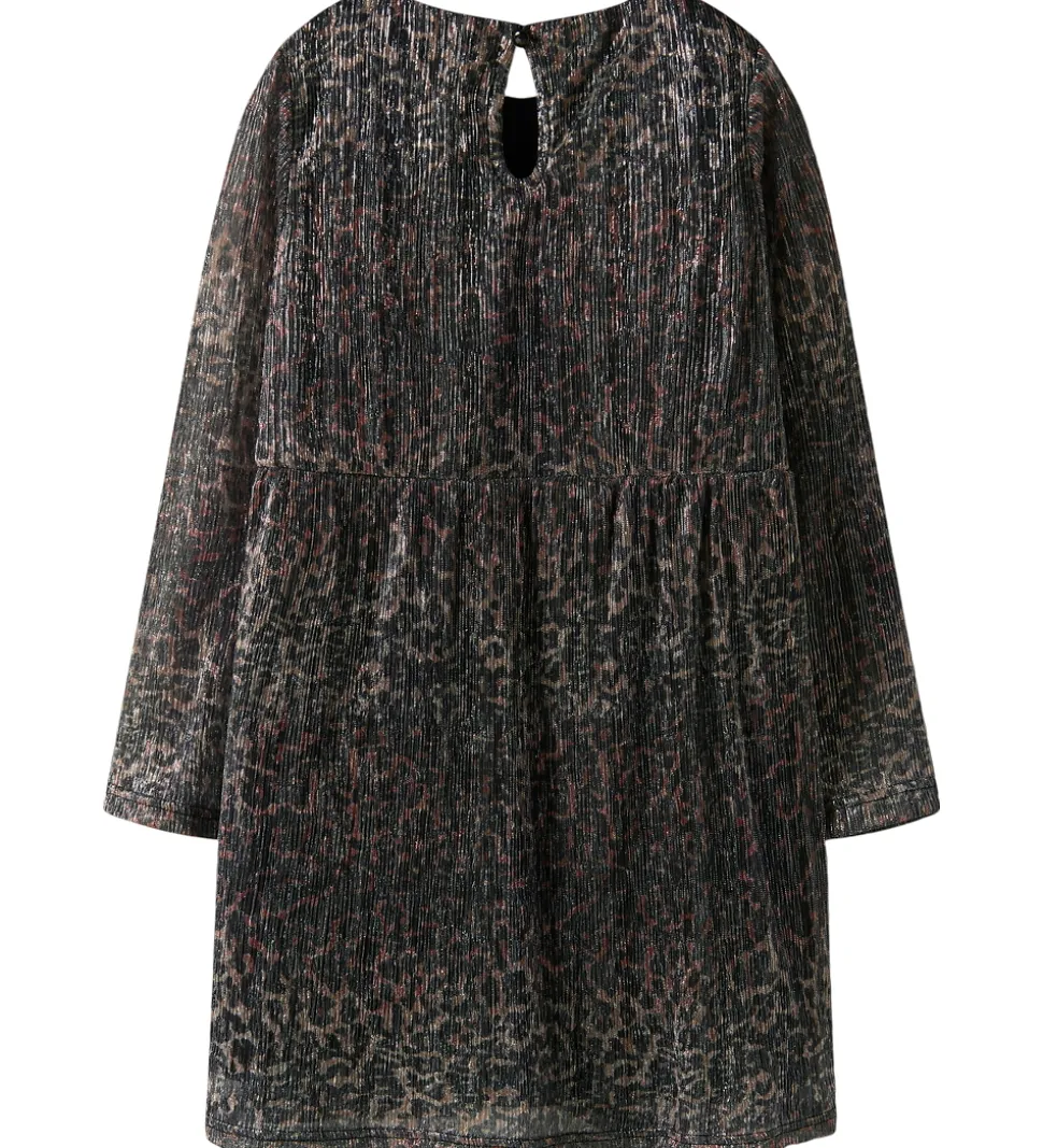 Smart kjole fra Name It med leopardmønster i sort og brune nuancer og glimmereffekt. Kjolen har plisseret struktur og rund halsudskæring med knaplukning i nakken. Den har semitranparente ærmer og har en syning ved taljen.