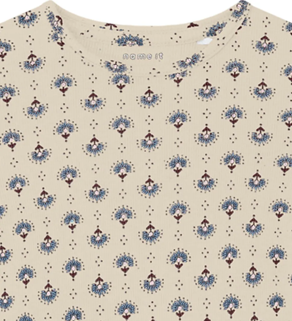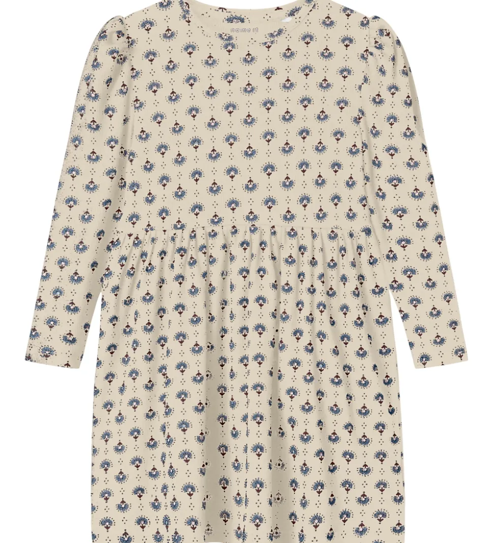 Elegant Name It kjole i lys beige med ribstruktur og blomsterlignende print i blå, brun og rosa. Kjolen har en rund halsudskæring og lange ærmer med puf ved skuldrene. I taljen er der en elastisk syning, som giver en flot pasform.