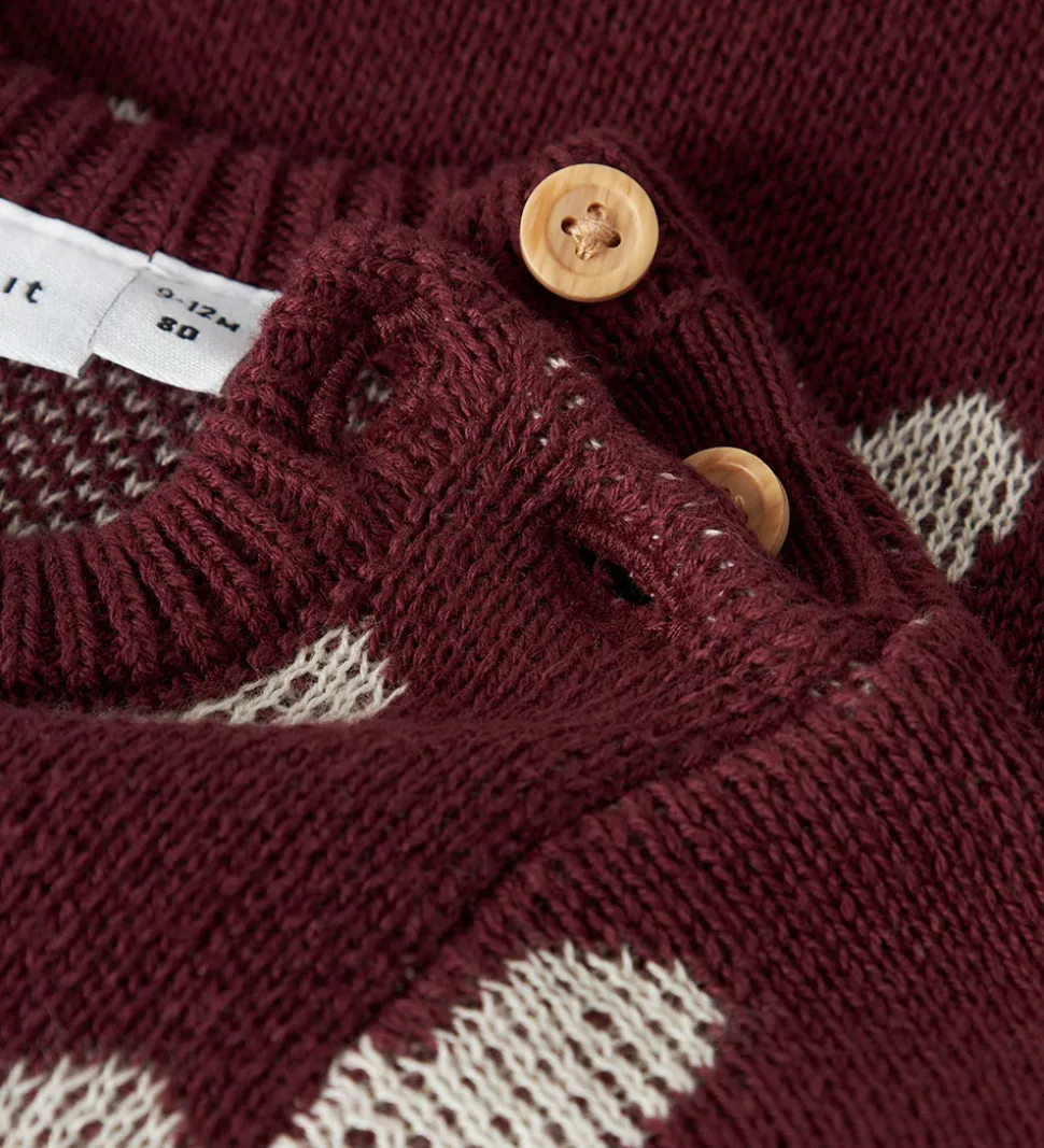 Skøn Name It kjole i mørkerød med hvide hjerter. Kjolen har en strikket struktur. Den har med rund halsudskæring med to knapper ved skulderen og lange ærmer. Kjolen har en syning ved taljen, som giver skørtet god vidde.