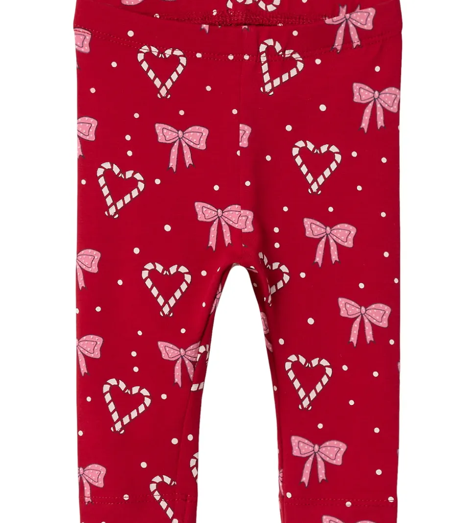 Charmerende Name It leggings i rød med et alloverprint af sløjfer, slikstokke formet som hjerter og hvide prikker. Name It leggingsene har en elastisk talje, der sikrer en behagelig pasform.