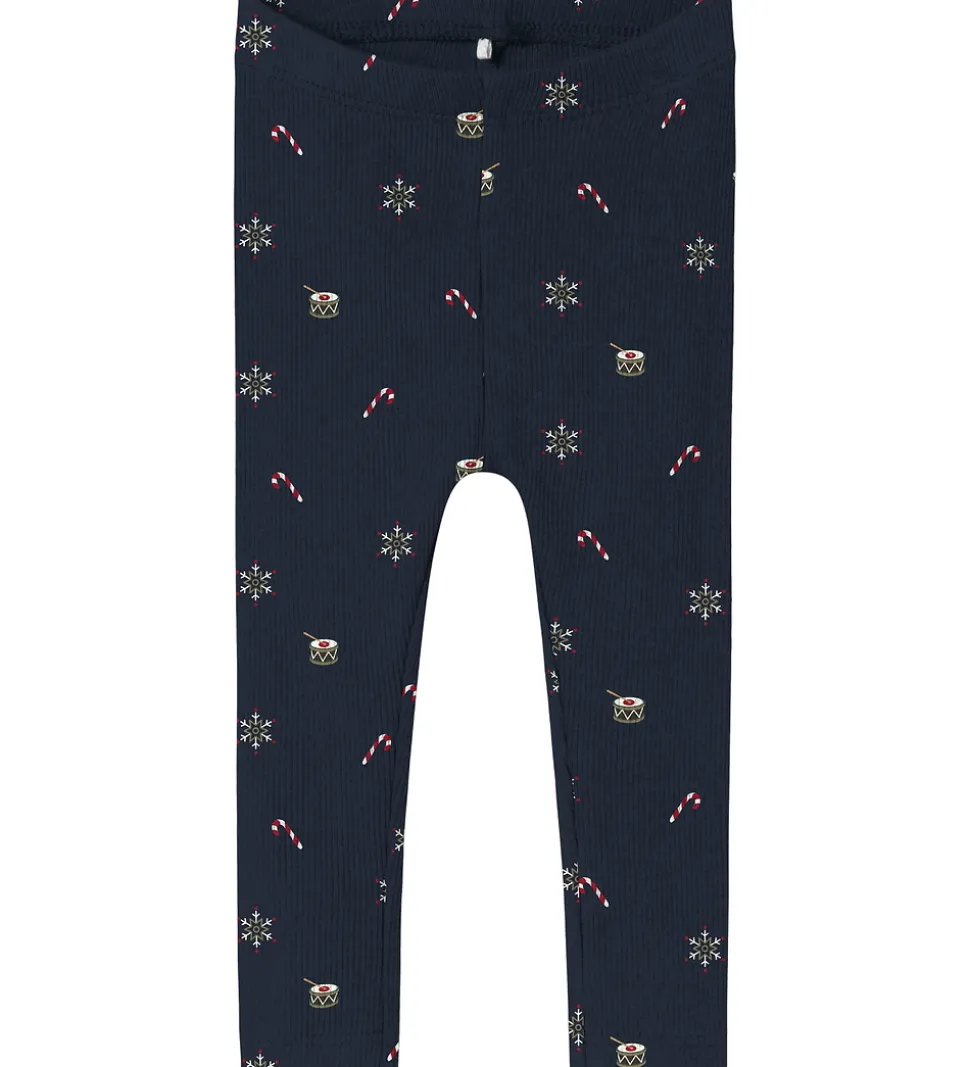 Flotte Name It leggings i navyblå med et alloverprint af små julemotiver. Leggingsene har ribstruktur og en elastisk talje, som giver en behagelig pasform.
