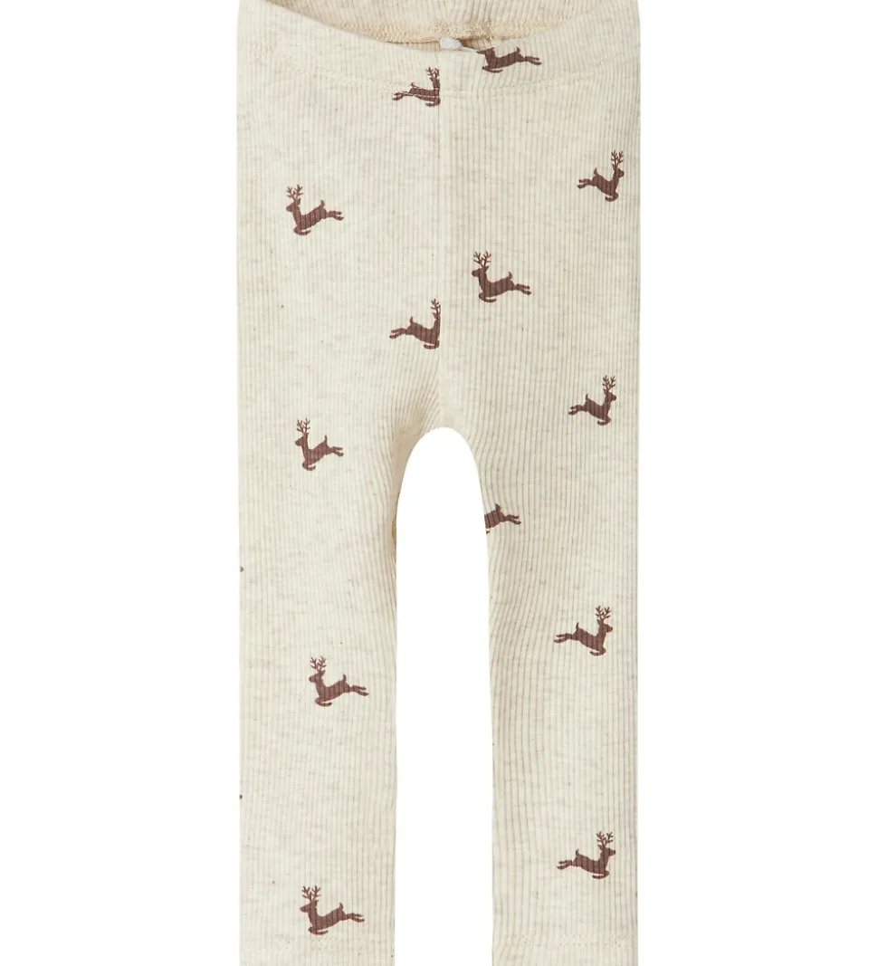 Skønne Name It leggings i beige med et alloverprint af brune rensdyr. Leggingsene har ribstruktur og en elastisk talje, som giver en behagelig pasform.