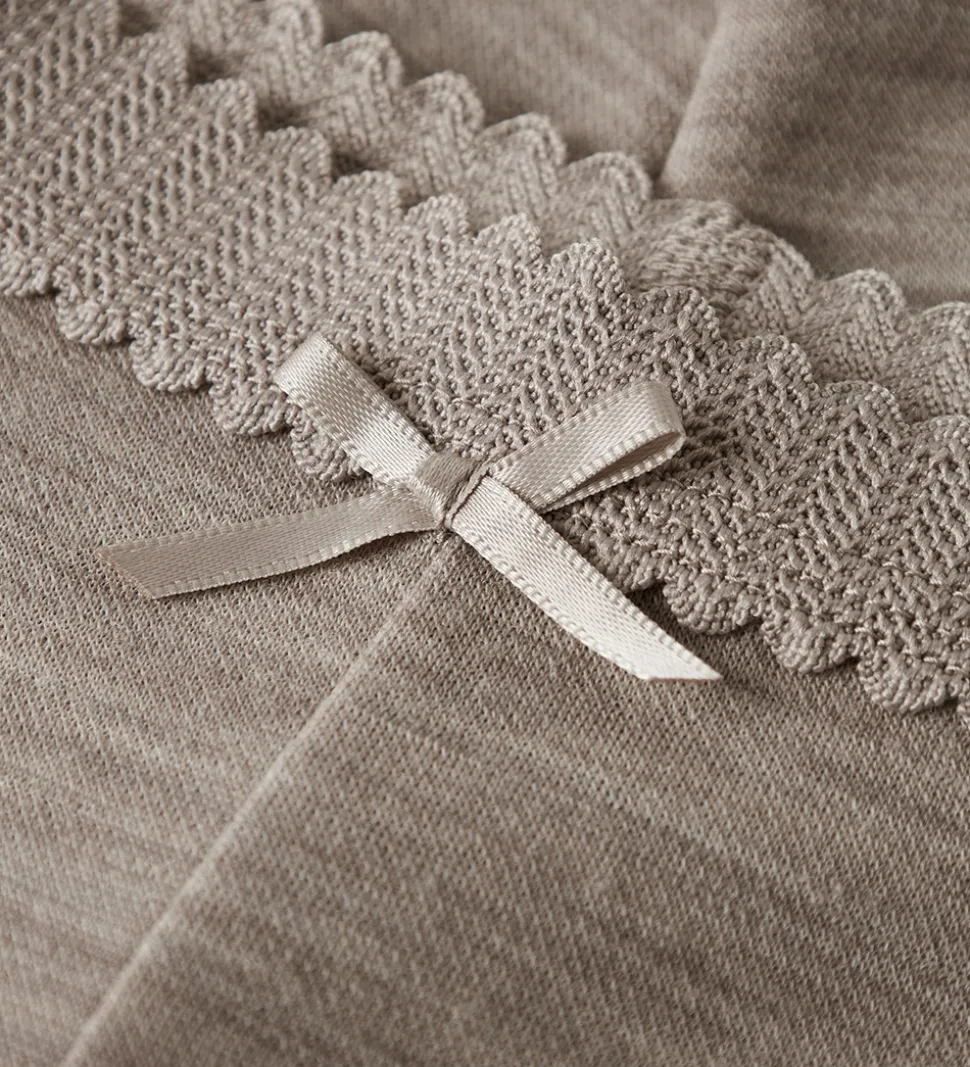 Skønne Name It leggings i meleret gråbrun med en dekorativ sløjfe foran. Leggingsene har en elastik med blonde i taljen og ribkanter ved anklerne. De er fremstillet af merinould og viskose.