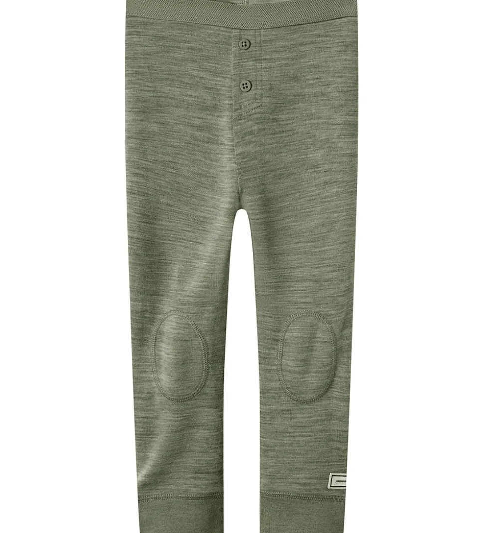 Flotte Name It leggings i meleret grøn med runde syninger på knæene og en hvid applikation nederst på venstre ben. Name It leggingsene har en elastisk talje med dekorative knapper fortil og ribkanter ved anklerne. Legginsene er fremstillet af merinould og viskose.