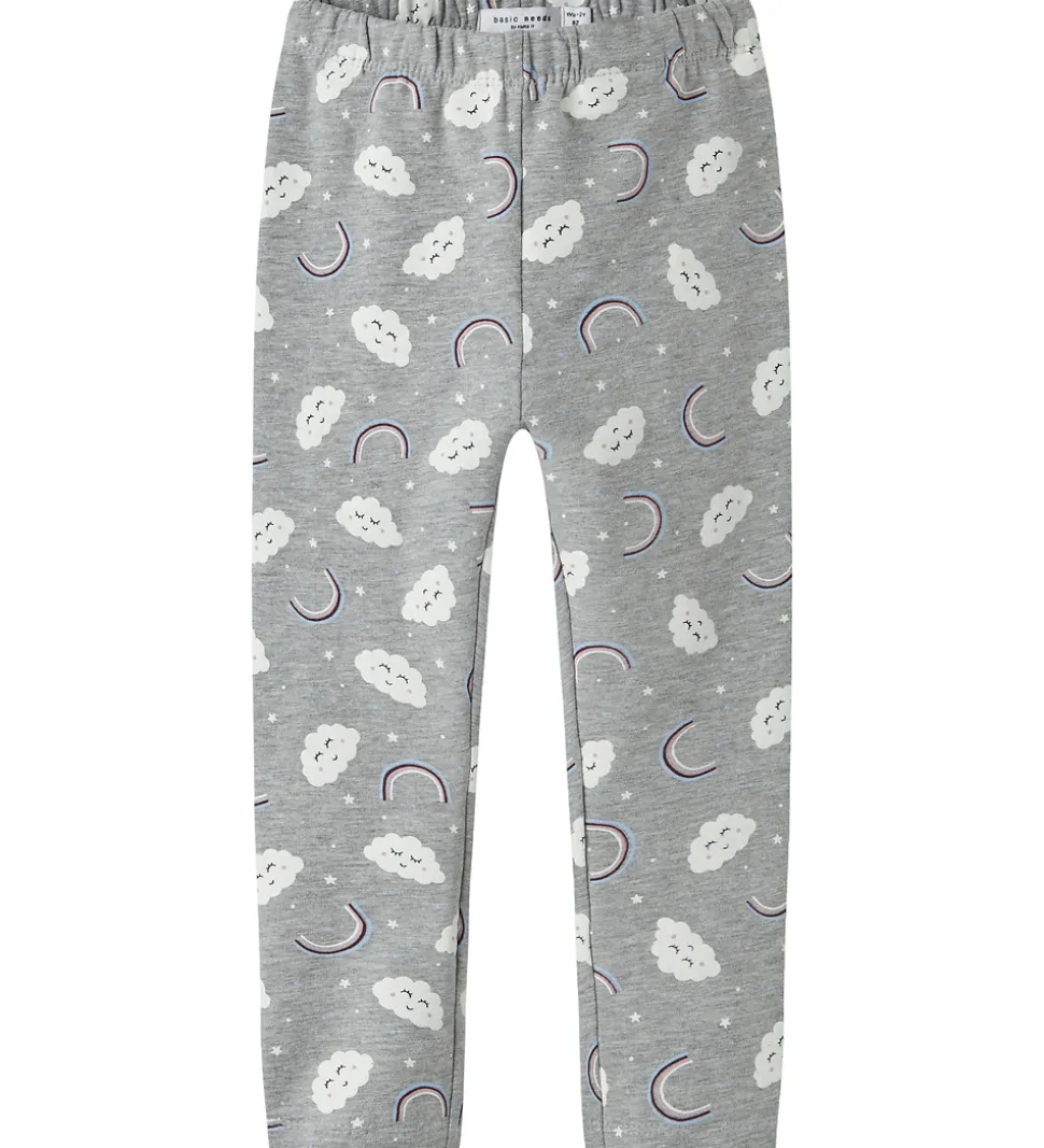 Fine Name It leggings i gråmeleret med et mønster af skyer og regnbuer. Name It leggingsene har en elastisk talje, der sikrer en god pasform.