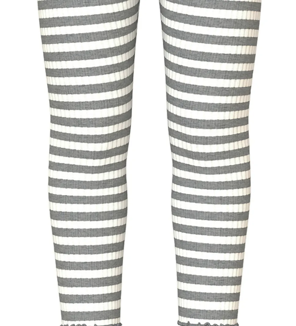 Smukke Name It leggings i stribet hvid og gråmeleret med ribstruktur. Name It leggingsene har en god elastik i taljen og bølgede kanter ved anklerne.