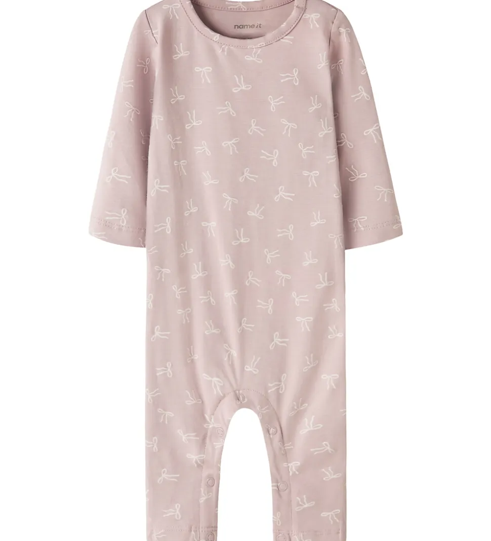 Charmerende Name It natdragt i lyselilla med alloverprint af små sløjfer i en lysere nuance. Natdragten har lange ærmer og lange ben med mulighed for ombuk til lukkede fødder. Den lukkes med trykknapper ved venstre skulder og mellem benene.