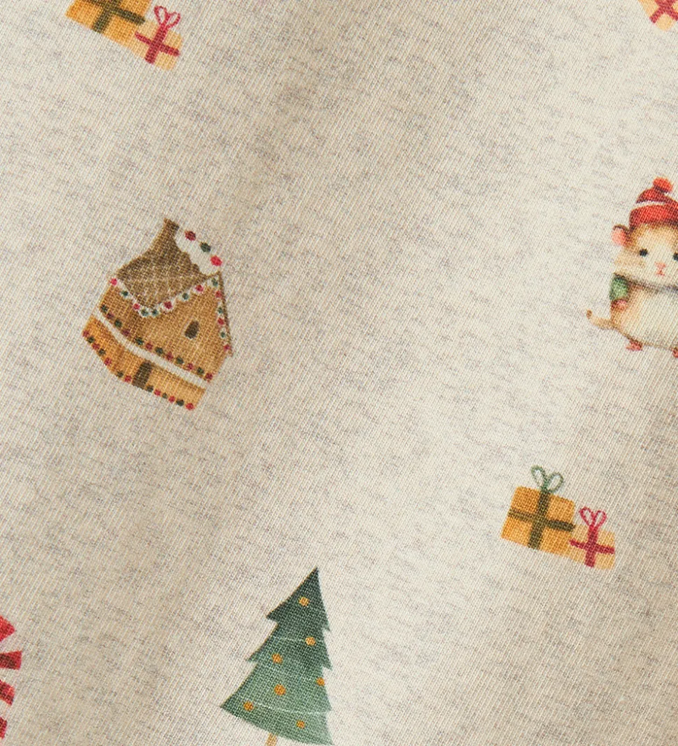 Charmende Name It natdragt i en lys meleret beige nuance. Natdragten er dekoreret med et festligt mønster af juletræer, slikstokke, gaver og andre julemotiver. Natdragten har en rund halsudskæring med tryknapper ved venstre skulder og lange ærmer. Den lukkes mellem benene med trykknapper.