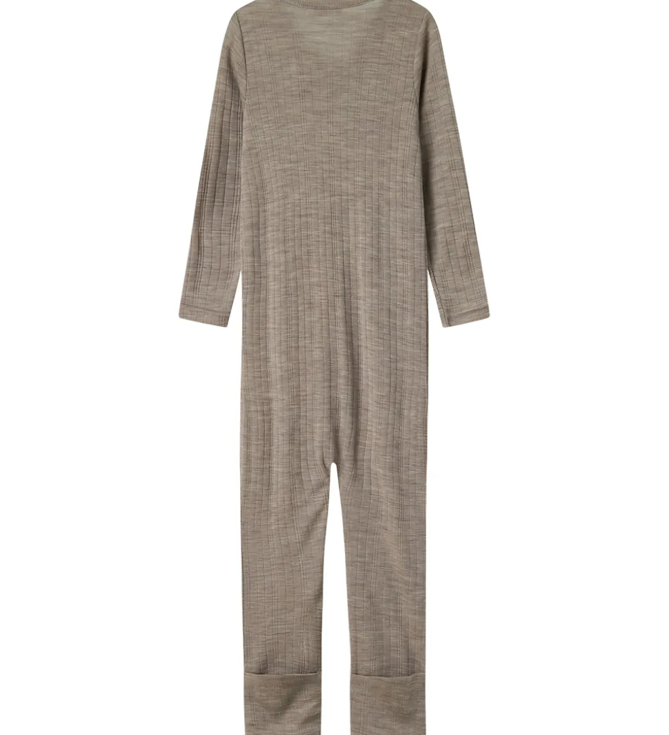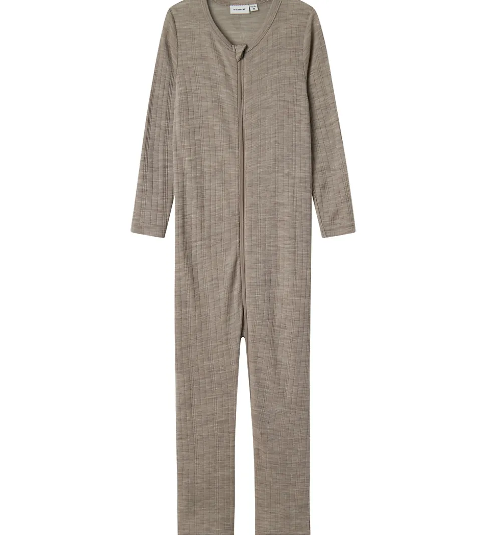 Elegant Name It natdragt i gråbeige med fin ribstruktur. Natdragten har en rund halsudskæring og lynlås fortil med hagesbeskytter og indvendig vindstolpe. Natdragten har lange ærmer og lange ben med mulighed for ombuk til lukkede fødder. Den er fremstillet i blødt og åndbart merinould.