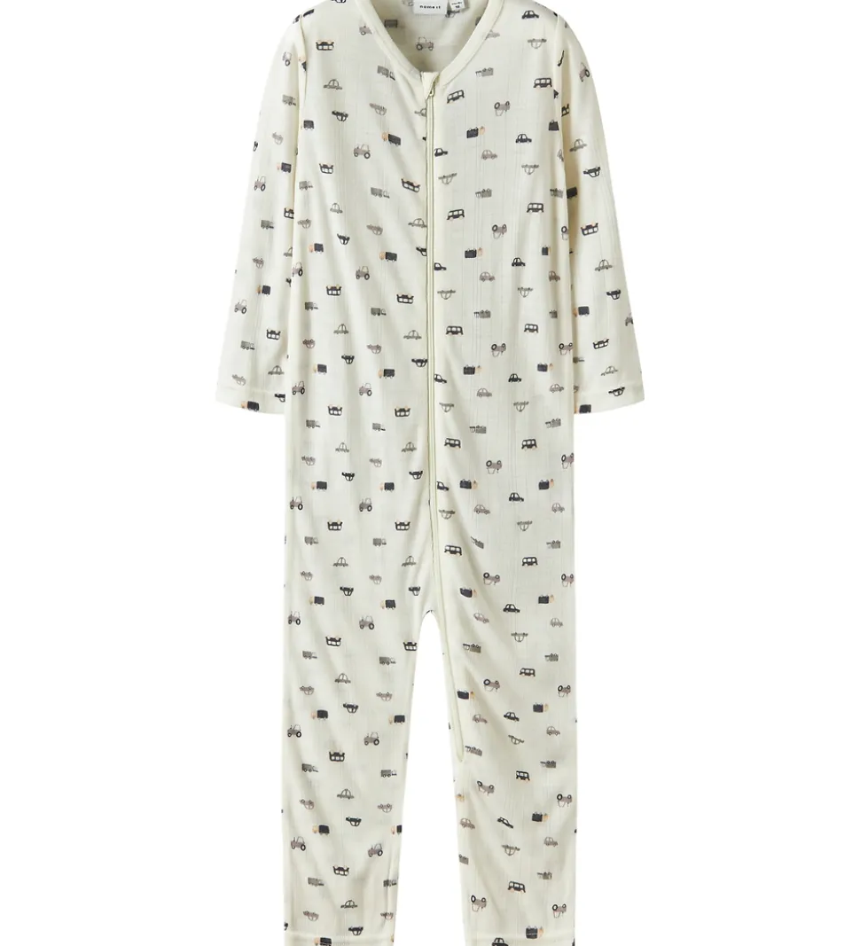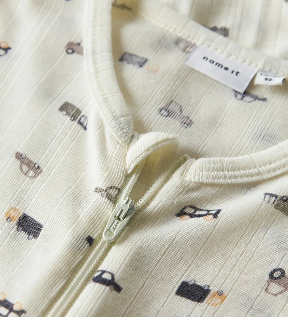 Sød Name It natdragt i hvid med print af små biler i blå og grå nuancer og med fin ribstruktur. Natdragten har en rund halsudskæring og lynlås fortil med hagesbeskytter og indvendig vindstolpe. Natdragten har lange ærmer og lange ben med mulighed for ombuk til lukkede fødder. Den er fremstillet i blødt og åndbart merinould.