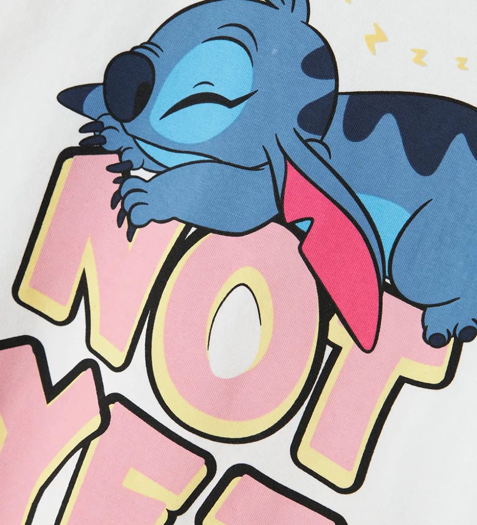 Flot Name It natkjole i hvid dekoreret med sovende Stitch og teksten “Not Yet” i lyse farver. Natkjolen har korte ærmer og en rund halsudskæring. Det løse snit sikrer en behagelig pasform.